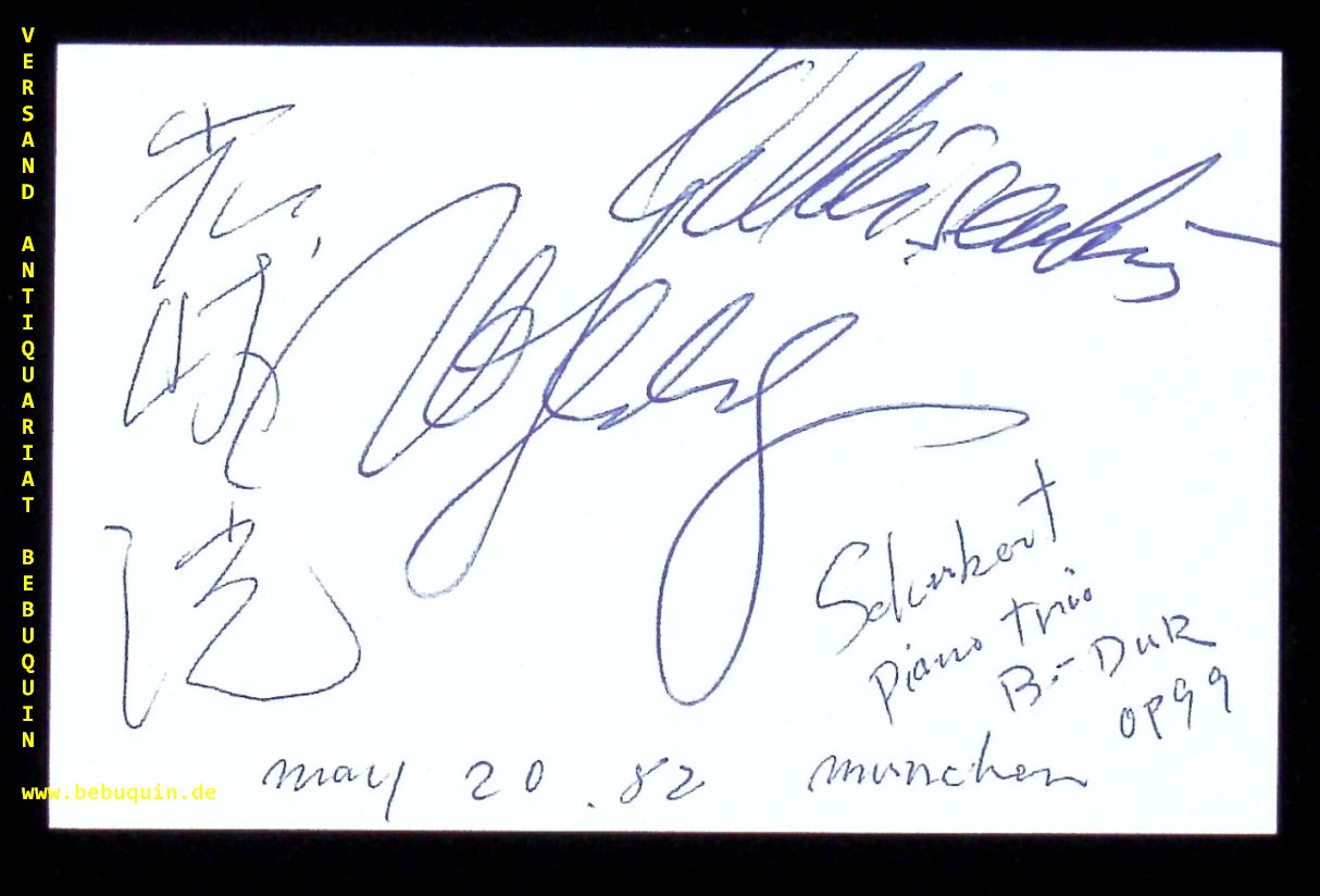 IWASAKI, Ko (Cellist) + MAISENBERG, Oleg (Pianist) + KREMER, Gidon (Violinist): eigenhändig von allen signierte und datierte Autogrammkarte. München (Herkulessaal), 20.5.1982. Karteikarte. Ko Iwasaki (* 1944 in Japan) ist ein US-amerikanischer Cellist und Musikpädagoge japanischer Herkunft. Oleg Iossifowitsch Maisenberg (* 29. April 1945 in Odessa) ist ein russischer Pianist und Professor an der Universität für Musik und darstellende Kunst in Wien. (Wikipedia)
