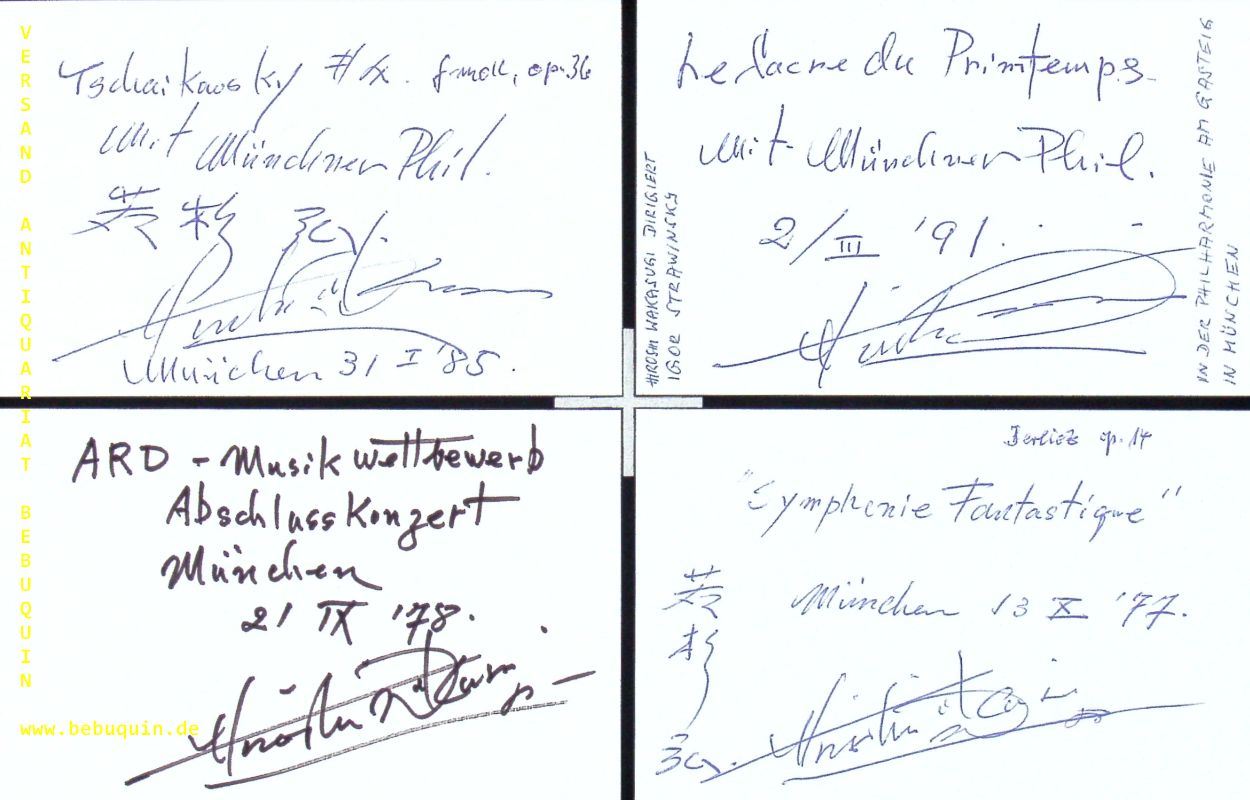 WAKASUGI, Hiroshi (Dirigent): 11 eigenhändig signierte und datierte Autogrammkarten mit teilwese längeren eigenhändigen Programmbeschreibungen. München (Philharmonie), 1976 – 1997. 8 x 12,5 cm. 11 Karteikarten. Hiroshi Wakasugi (* 31. Mai 1935 in New York; † 21. Juli 2009 in Tokio) war ein japanischer Dirigent. Wakasugi führte viele der wichtigsten europäischen Opern zum ersten Mal in Japan auf und wurde dafür mehrfach ausgezeichnet.
