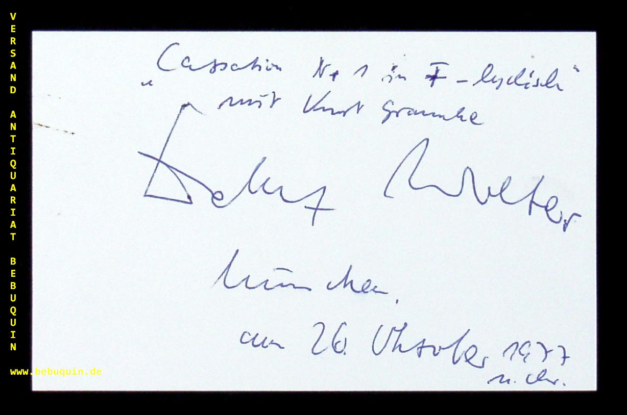 WOLTER, Detlev (Komponist): eigenhändig signierter und datierter Autogrammkarten. München, 26.10.1977. 8 x 12,5 cm. Karteikarte. Detlef Franz Emil Wolter (* 11. März 1933 in Berlin; † 23. Februar 2002 ebenda) war ein deutscher Komponist. (Wikipedia)