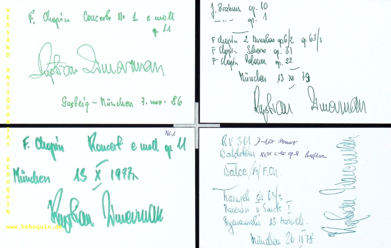 ZIMERMAN, Krystian (Pianist): 9 eigenhändig mit Grünstift signierte und datierte Autogrammkarten. München (Philharmonie), 1977 – 2004. 8 x 12,5 cm. 9 Karteikarten Krystian Zimerman (* 5. Dezember 1956 in Zabrze, Polen) ist ein polnischer Pianist. Seit 1996 lebt Krystian Zimerman mit seiner Familie in Basel, wo er eine Meisterklasse an der Musikhochschule Basel leitet. Im April 2009 sorgte er für einen Eklat während eines Konzerts in den Vereinigten Staaten, als er von der Bühne in Bezug auf den amerikanischen Raketenschild in Polen forderte: Get your hands off my country („Lassen Sie Ihre Hände von meinem Land“). Diese Äußerung war möglicherweise auch persönlich motiviert, da Zimermans Steinway-Flügel acht Jahre zuvor, kurz nach den Terroranschlägen des 11. September bei der Einreise in die USA wegen Terrorverdachts vom Zoll konfisziert und vernichtet wurde. (Wikipedia)