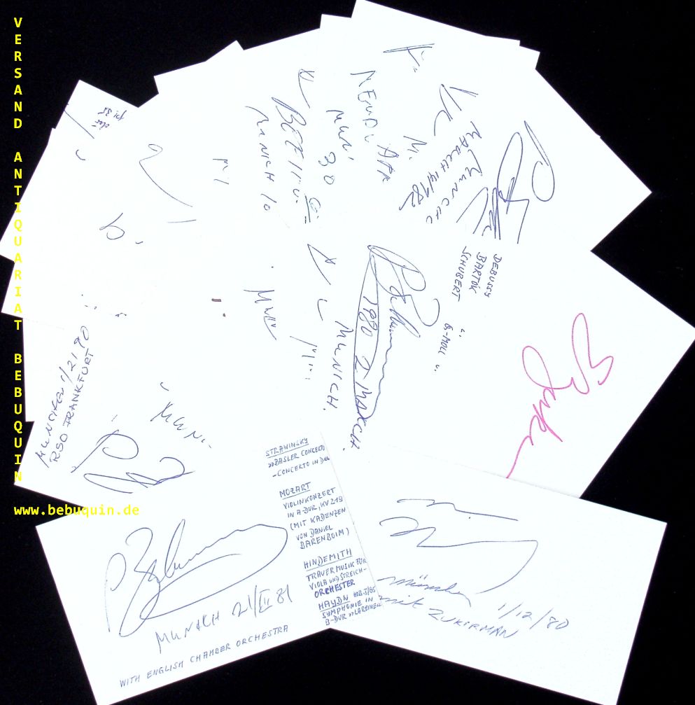 ZUKERMAN, Pinchas (Violinist): 20 eigenhändig signierte und datierte Autogrammkarten. München (Philharmonie), 1969 – 2006. 8 x 12,5 cm. 20 Karteikarten. Pinchas Zukerman (* 16. Juli 1948 in Tel Aviv) ist ein israelischer Violinist, Bratschist und Dirigent. Marc Neikrug (* 24. September 1946 in New York City) ist ein US-amerikanischer Komponist und Pianist. Ab Mitte der 1970er Jahre trat Neikrug als Duopartner von Pinchas Zukerman auf. Seit 1998 ist er künstlerischer Leiter des Santa Fe Chamber Music Festival. Seine Laufbahn als Komponist begann 1966 mit einem Klavierkonzert. Bekannt wurde er durch sein Musiktheaterstück Through Roses (1980). Das Auftragswerk der New Yorker 92nd Street Y erzählt die Geschichte eines Geigers, der Auschwitz überlebte. Es wurde in elf Sprachen übersetzt und erlebte über 500 Aufführungen in fünfzehn Ländern. (Wikipedia)