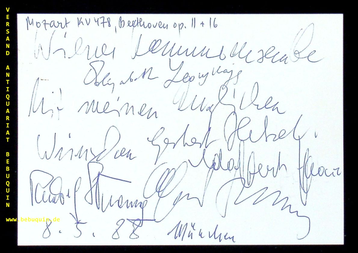 WIENER KAMMERENSEMBLE.– LEONSKAJA, Elisabeth (Pianistin) + HETZEL, Gaerhart u.v.a.: eigenhändig von allen signierte und datierte Autogrammkarte. München (Herkulessaal), 8.5.1988. 10,5 x 14,5 cm. große Karteikarte. Das Wiener Kammerensemble wurde 1970 von prominenten Mitgliedern der Wiener Philharmoniker gegründet. Die Besetzung reicht vom Trio bis zum Nonett, das Repertoire von der Klassik bis zur Moderne. Seinen Ruf als führende Formation seiner Besetzung erwarb sich das