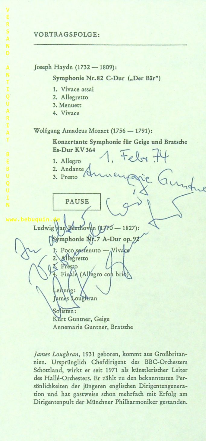 GUNTNER, Kurt (Violinist) + Annemarie (Bratschistin): eigenhändig von beiden signierte und datierte Programmseite. München, 1.2.1974. 21 x 10 cm. 1 Bl. Konzertmeister war Kurt Guntner über viele Jahre unter anderem im Bayreuther Festspielorchester, im Münchner Bachorchester unter Karl Richter und der Solistengemeinschaft der Bachwoche Ansbach engagiert. Außderdem war er 25 Jahre lang Mitglied des international gefeierten „Odeon-Trios“. (Wikipedia)