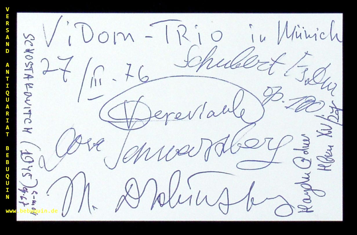 VIDOM TRIO (HAIFA).– SCHWARZBERG, Dora (Violinistin) + DROBINSKY, Mark (Cellist) + DEREVENKO, Victor (Pianist): eigenhändig vin allen signierte und datierte Autogrammkarte. München (Philharmonie), 27.3.1976. 8 x 12,5 cm. Karteikarte.
