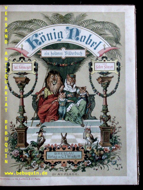 LOHMEYER, Julius: König Nobel. Ein heiteres Bilderbuch. 2. Aufl Breslau (Wiscott), ca 1888. 30,5 x 24,5 cm. 24 Bl mit 41 teilsweise ganzseitigen farblithographischen Bildern und Bildtafeln von Fedor Flinzer sowie den gestalteten Vorsatzpapieren. farb. ill. OHLn. mit reicher Gold- und Blindprägung. Kanten etwas berieben, sonst feines Ex. Seltene Ausgabe dieses sehr beliebten Bilderbuchs. Voller Poesie und Phantasie gestaltet, erzählen Lohmeyer und Flinzer Geschichten des versuchten Verrats an König Nobel. Die Tiercharakteristika sind glänzend getroffen und stellen eine witzige Weiterentwicklung der von Grandville und kaulbach gefundenen Lösungen dar. Seebaß 1187.