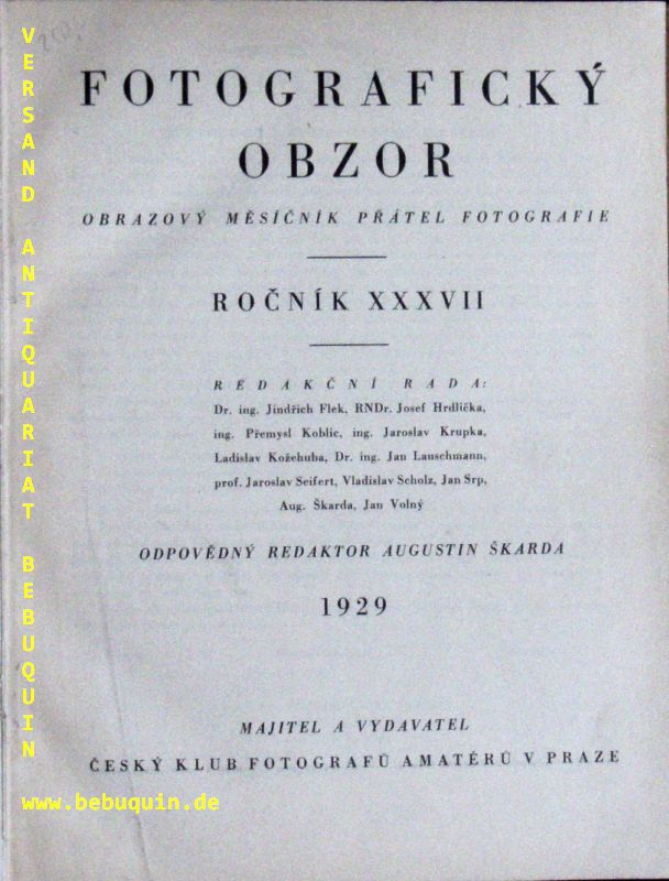 FLEK / HRDLICKA / KOBLIC / KRUPKA / KOZEHUBA / LAUSCHMANN / SEIFERT / SCHOLZ / SRP / SKARDA / VOLNY: Fotograficky Obzor. Obrazovy Mesicnik Pratel Fotografie. Rocnik XXXVII. Prag (Cesky Klub Fotografu), 1929. Gr. 8°. 190 (6) S. mit zahlr. Bildern. OLn mit Goldprägung. kaum bestaubt. seltenes tschechisches Fotografie-Periodikum.