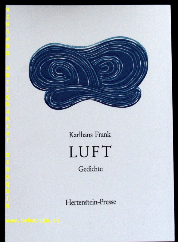 PRESSENDRUCKE.– FRANK, Karlhans: Luft. Gedichte. Pforzheim (Hertenstein-Presse), 1992. Fol. 8 ungez. Bl. mit 5 farbigen, von Axel Hertenstein signierten Orig.-Linolschnitten. ill. OKart. tadellos. Nr. 463 von 500 numerierten und von Autor und Künstler signierten Ex. der EA.