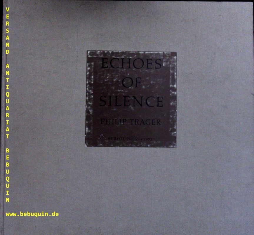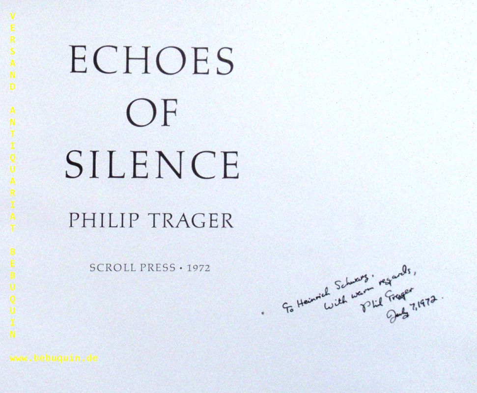 TRAGER, Philip: Echoes of Silence. Danbury (Scroll), 1972. 36 x 38 cm. 3 Bl., 12 Bildtafeln, 1 Bl. OLn. Einband etwas bestaubt. Nr. 165 von 1000 Ex. der EA mit einer 4zeiligen eigenhändigen datierten und signierten Verfasserwidmung auf Titelseite.