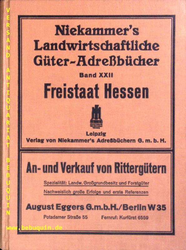 KASSEL.– NIEKAMMER.– GÜTER – ADRESSBUCH FÜR HESSEN.– Bd. XXII. Landwirtschaftliches Adreßbuch der Domänen, Güter und größeren Höfe. Verzeichnis sämtlicher Domänen, Güter, Höfe, Land-, Weinbau- und Forstbetriebe mit Angabe der Gesamtfläche . des Viehbestandes, der Fernsprechanschlüsse, Angabe der Besitzer, Pächter und Verwalter, der Post-, Telegraphen- und Eisenbahnstationen . einem alphabetischen Orts- und Personenregister, sowie einer Karte. Herausgegeben von Hans Wehner. Leipzig (Niekammer), 1932. Gr. 8°. XX, 228 S. + die farb. Faltkarte. ill. OLn. tadellos. = Niekammer`s Güter-Adressbücher. 1. und einzige Ausgabe. Von großer Seltenheit.