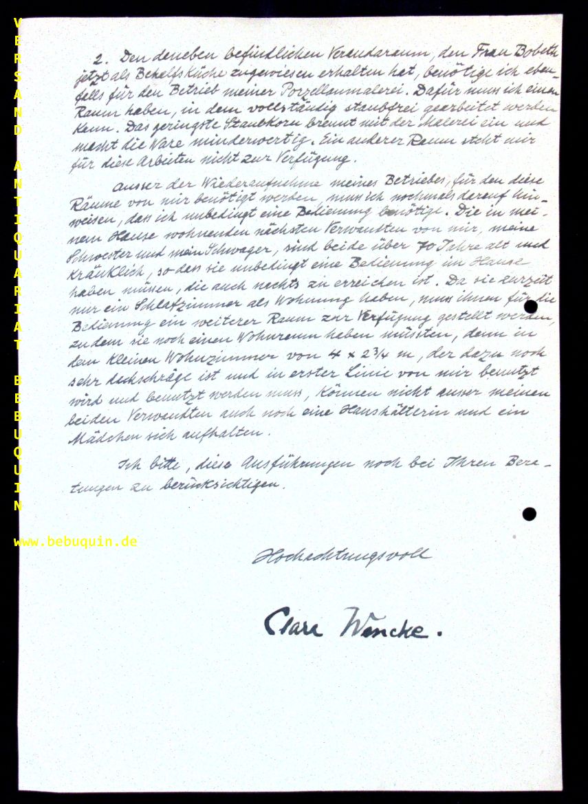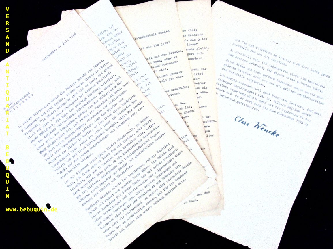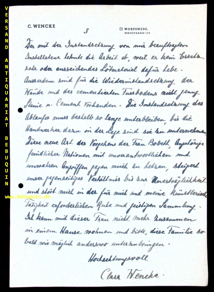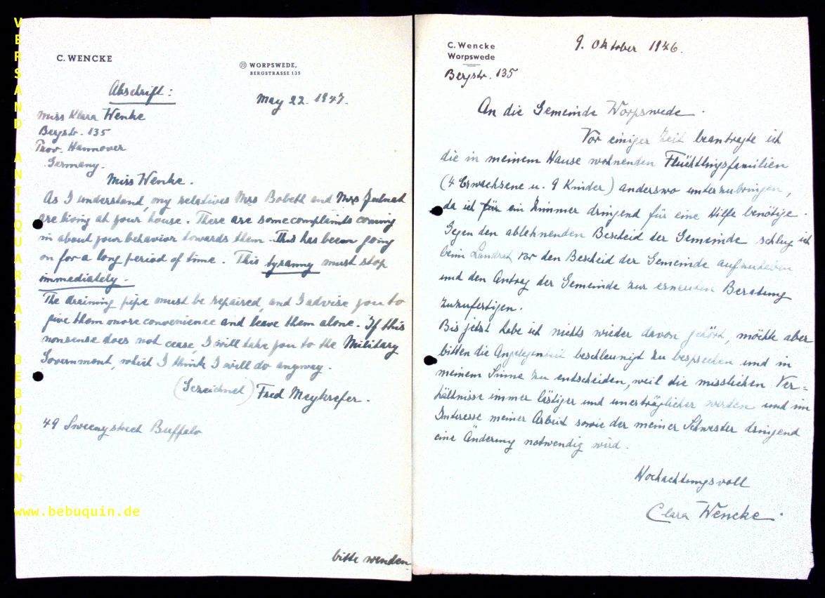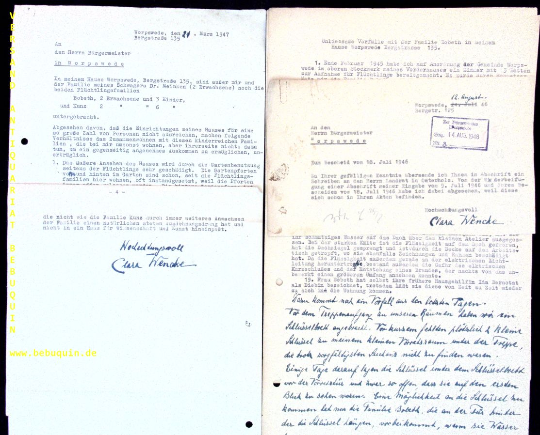 WORPSWEDE.– WENCKE, Clara: 5 eigenhändige Briefe mit voller Signatur der Schwester der berühmten Malerin Sophie Wencke sowie 3 umfangreiche maschinengeschriebene und voll signierte Briefe an den Bürgermeister von Worpswede sowie den Landrat von Osterholz. Es geht um den Künstleralltag der Schwestern sowie dessen Störung durch die Anwesenheit der zahlreichern Flüchtlinge: Wegen des feindseiligen Verhaltens der Familie Bobeth in meinem Haus gegen mich, (…) habe ich bereits beantragt, diese Familie aus meinem Hause zu nehmen und anderswo unterzubringen. Jetzt hat Frau Bobeth mich anscheinend bei ihren Verwandten in Amerika verleumdet (…) und sich an das Military Government gewandt. über 10 Schriftstücke. Worpswede, 1947. ca 20 Bl. seitlich gelocht. Die Kunstmalerin Sophie Wencke, die am 29. Juli 1874 als erste Tochter des Werftbesitzers Nicolaus Diedrich Wencke und Enkelin des Werftgründers Friedrich Wilhelm Wencke in Bremerhaven geboren wurde und am 23.06.1963 in Worpswede starb, bezog 1910 gemeinsam mit ihrer jüngeren Schwester Clara Wencke den Neubau eines eigenen Atelierhauses in der Bergstraße, in dem sich heute das „Cafe Central“ und „Maigrün“ befinden, in Worpswede, das heute Wencke-Haus genannt wird. (Internet) Anbei auch ein Plan des Hauses etc.