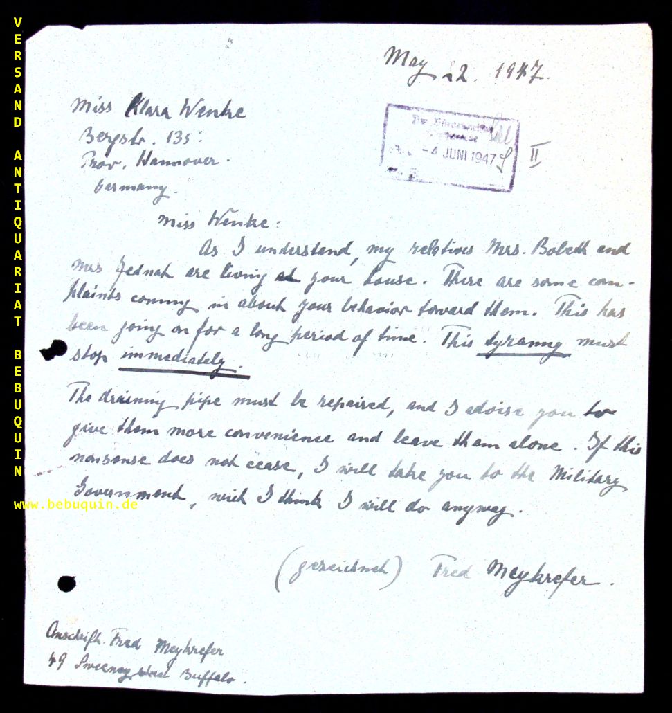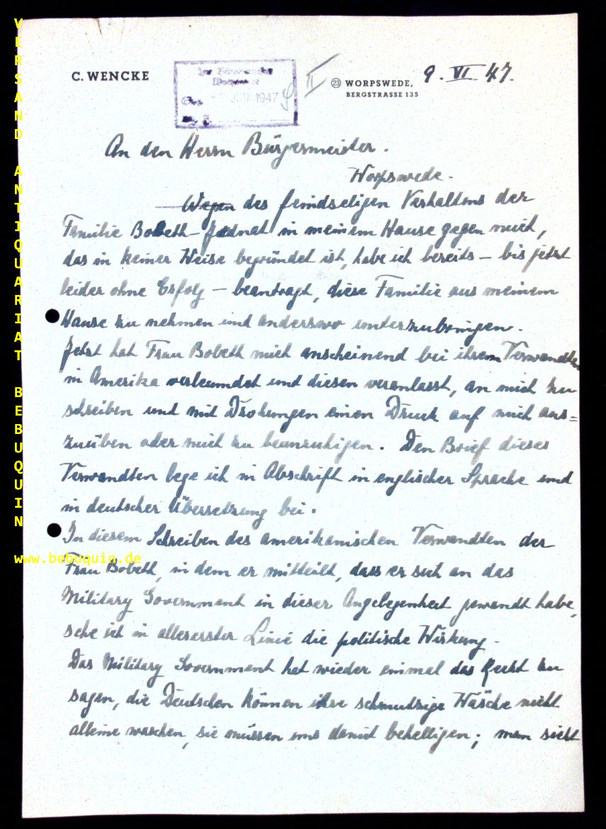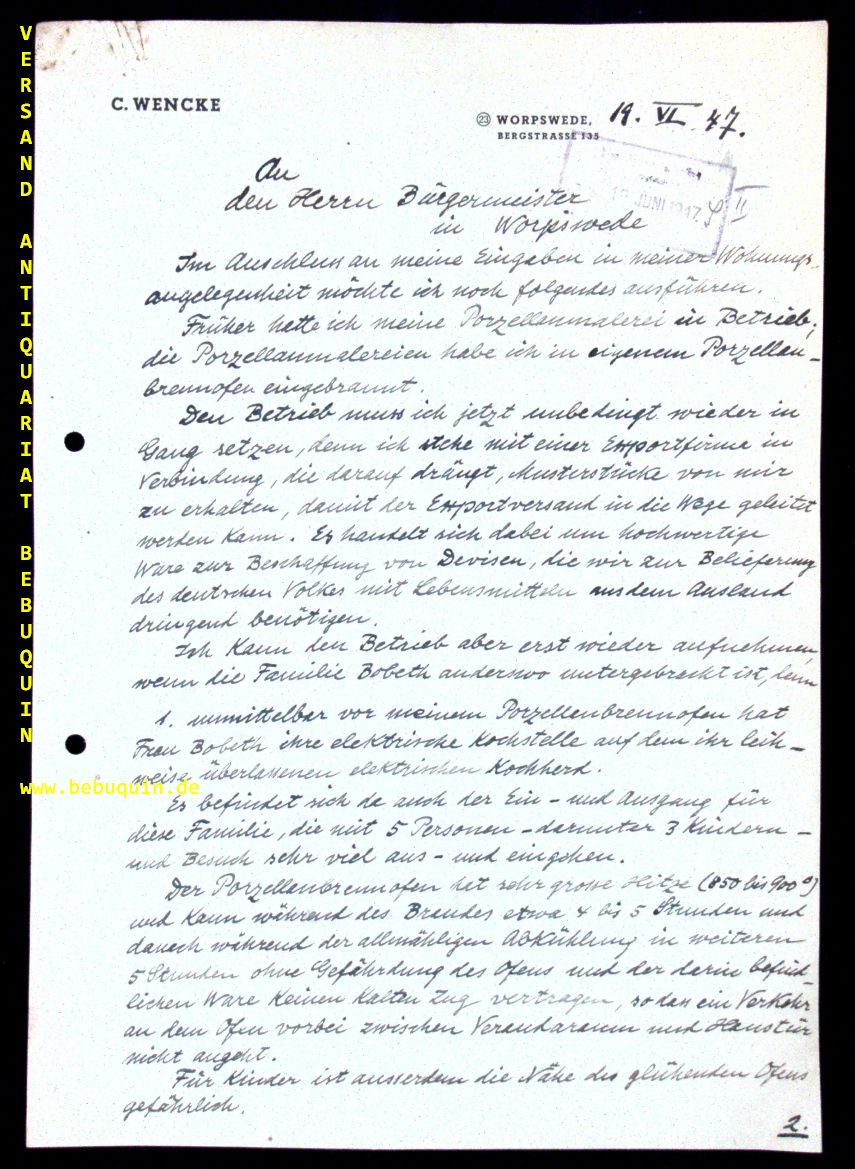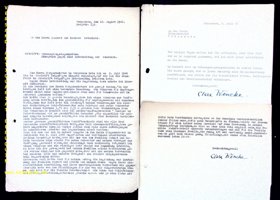 WORPSWEDE.– WENCKE, Clara: 5 eigenhändige Briefe mit voller Signatur der Schwester der berühmten Malerin Sophie Wencke sowie 3 umfangreiche maschinengeschriebene und voll signierte Briefe an den Bürgermeister von Worpswede sowie den Landrat von Osterholz. Es geht um den Künstleralltag der Schwestern sowie dessen Störung durch die Anwesenheit der zahlreichern Flüchtlinge: Wegen des feindseiligen Verhaltens der Familie Bobeth in meinem Haus gegen mich, (…) habe ich bereits beantragt, diese Familie aus meinem Hause zu nehmen und anderswo unterzubringen. Jetzt hat Frau Bobeth mich anscheinend bei ihren Verwandten in Amerika verleumdet (…) und sich an das Military Government gewandt. über 10 Schriftstücke. Worpswede, 1947. ca 20 Bl. seitlich gelocht. Die Kunstmalerin Sophie Wencke, die am 29. Juli 1874 als erste Tochter des Werftbesitzers Nicolaus Diedrich Wencke und Enkelin des Werftgründers Friedrich Wilhelm Wencke in Bremerhaven geboren wurde und am 23.06.1963 in Worpswede starb, bezog 1910 gemeinsam mit ihrer jüngeren Schwester Clara Wencke den Neubau eines eigenen Atelierhauses in der Bergstraße, in dem sich heute das „Cafe Central“ und „Maigrün“ befinden, in Worpswede, das heute Wencke-Haus genannt wird. (Internet) Anbei auch ein Plan des Hauses etc.
