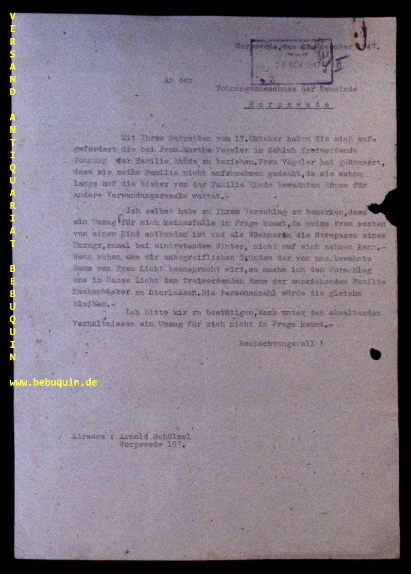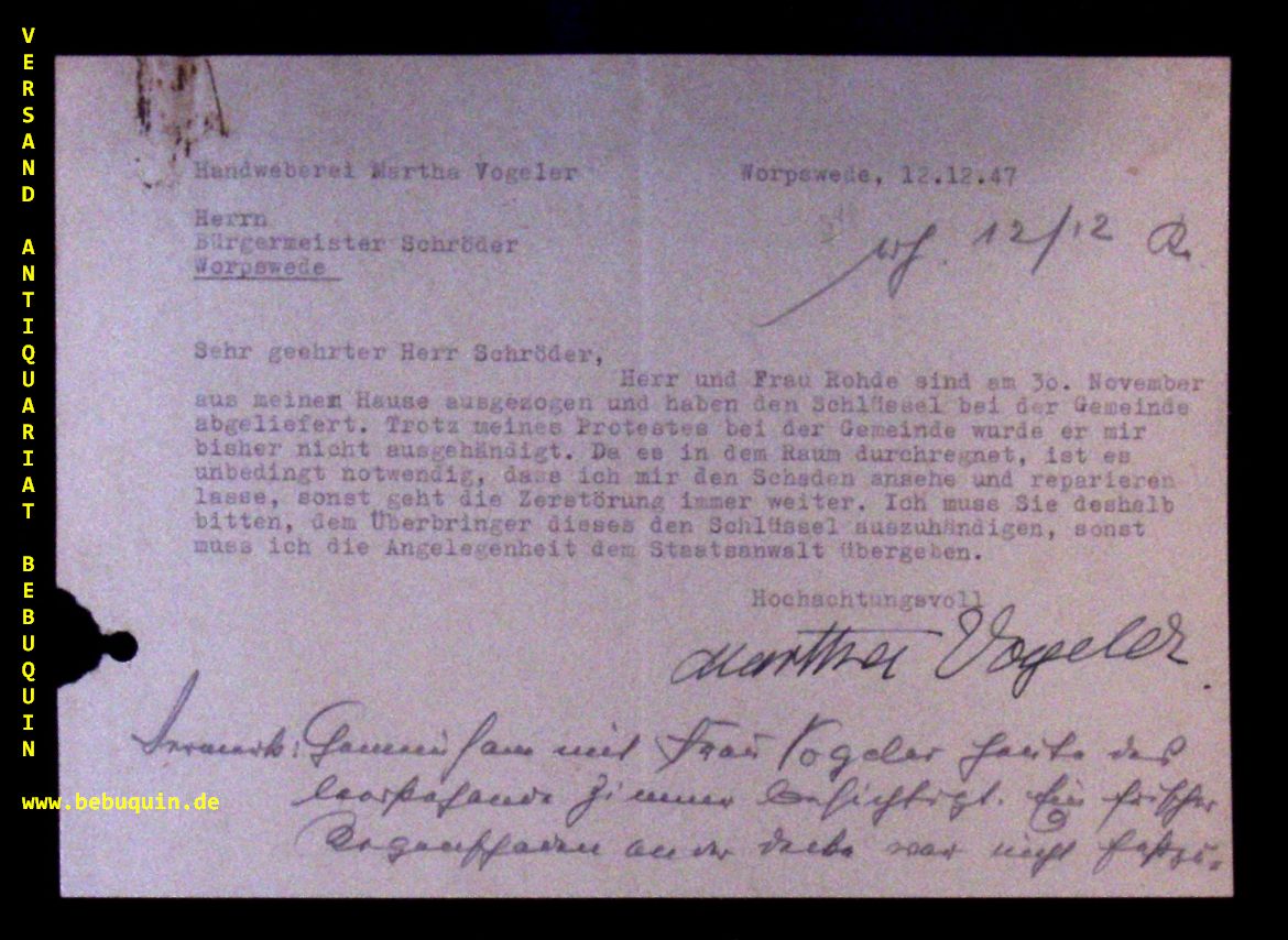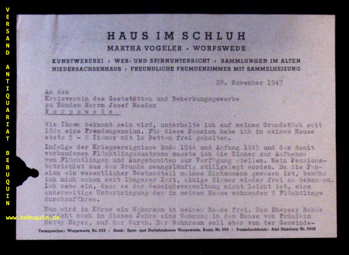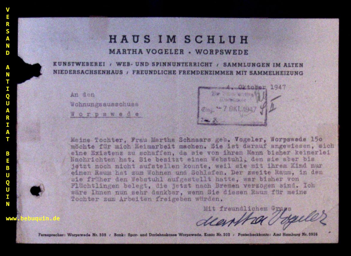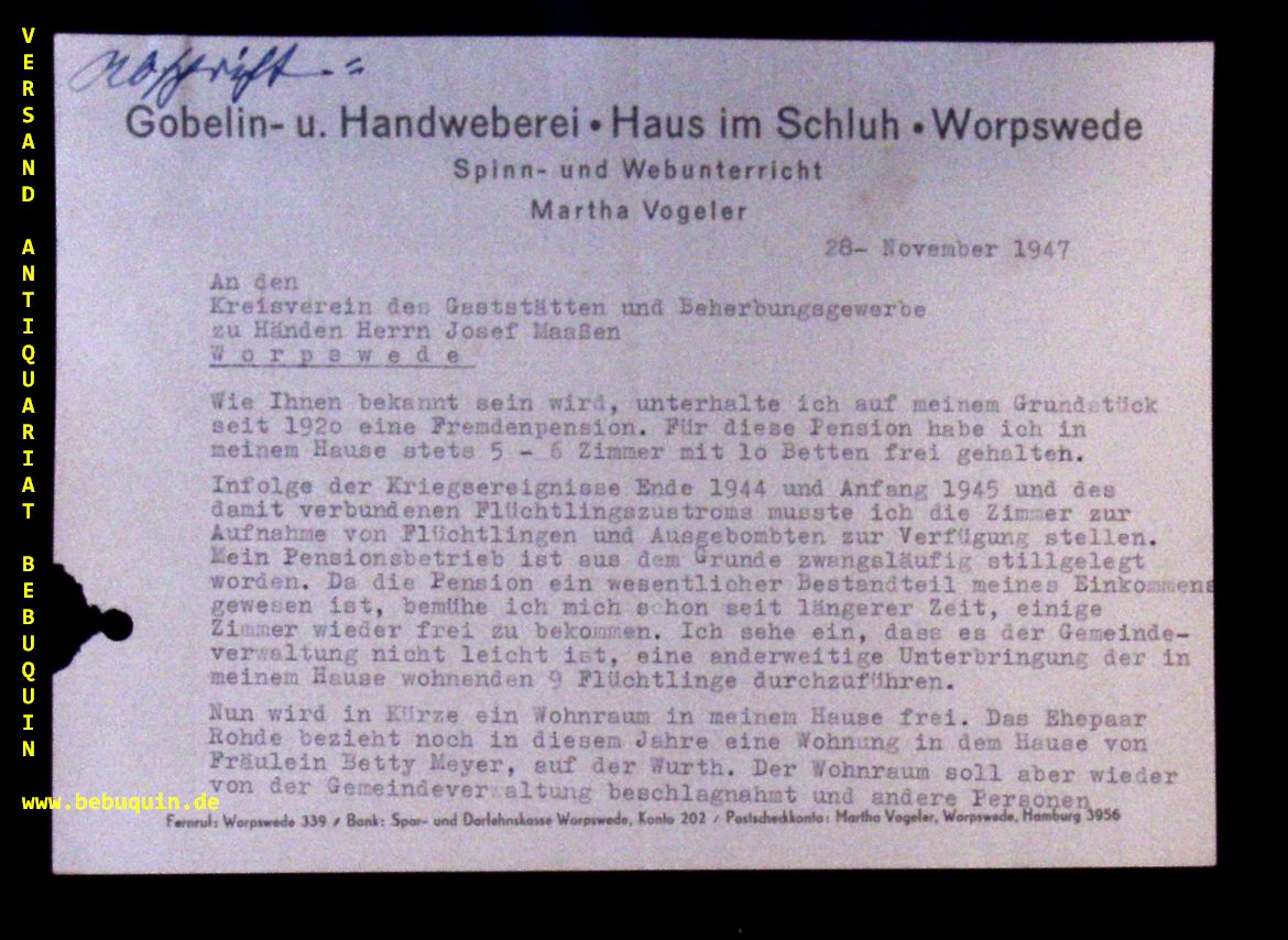 WORPSWEDE.– VOGELER, Martha.– 4 voll signierte ms Briefe auf Kopfbögen des „Haus im Schluh“ mit diversen Antwortschreiben. „Meine Tochter, Frau Martha Schnaars geb. Vogeler, Worpswede 150 möchte für mich Heimarbeit machen. Sie ist darauf angewiesen, sich eine Existenz zu schaffen, da sie von ihme Mann bisher keinerlei Nachricht hat. Sie besitzt einen Webstuhl, den sie aber bis jetzt noch nicht aufstellen konnte, weil sie mit ihrem Kind nur einen Raum hat zum Wohnen und Schlafen. Der zweite Raum, in dem sie früher den Webstuhl aufgestellt hatte, war bisher von Flüchtlingen belegt, die jetzt nach Bremen verzogen sind. Ich wäre Ihnen nun sehr dankbar, wenn sie diesen Raum für meine Tochter zum Arbeiten freigeben würden. Mit freundlichen Grüßen Martha Vogeler.“ Der ganze Vorgang zieht sich über zwei Monate hin und ist letztlich erfolgreich. Ein beeindruckendes Zeitdokument über das Leben nach dem Krieg. Worpswede, 3.3.1901. 7 Bl. seitliche Lochung teils ausgerissen. Diese Brieffolge stellt eine wichtige Ergänzung zu den bekanten Fakten zum Leben im Haus im Schluh dar, die im Folgenden kurz wiedergegeben werden.: Martha Schröder wurde als Tochter des Dorfschullehrers Dietrich Schröder und seiner Ehefrau Becka in Worpswede geboren. Der Vater starb 1885, sodass die Mutter die große Familie allein ernähren musste. Die drei ältesten Geschwister Marthas wanderten nach Amerika aus, die jüngeren Geschwister – wie Martha auch – unterstützten die Mutter durch Aushilfsarbeiten. Im Jahr 1894 lernte sie als Vierzehnjährige den in Bremen geborenen Maler Heinrich Vogeler kennen, als dieser Worpswede besuchte und im folgenden Jahr Mitglied der 1889 gegründeten Künstlerkolonie Worpswede wurde. Im Oktober 1895 kaufte Vogeler am Weyerberg ein Grundstück mit Bauernhaus, ließ dieses nach eigenen Plänen umbauen und gestaltete den Barkenhoff zu einer Insel der Schönheit. Martha stand Vogeler mehrfach Modell und heiratete ihn nach der Verlobung 1900 in Meissen am 6. März 1901. In der Folge war sie der Mittelpunkt des von Vogeler als Gesamtkunstwerk inszenierten gemeinsamen Haushaltes auf dem Barkenhoff und wurde von ihm weiterhin auf vielen Gemälden und Radierungen porträtiert. Sie ist dei große Muse des deutschen Jugendstils. (Wikipedia)