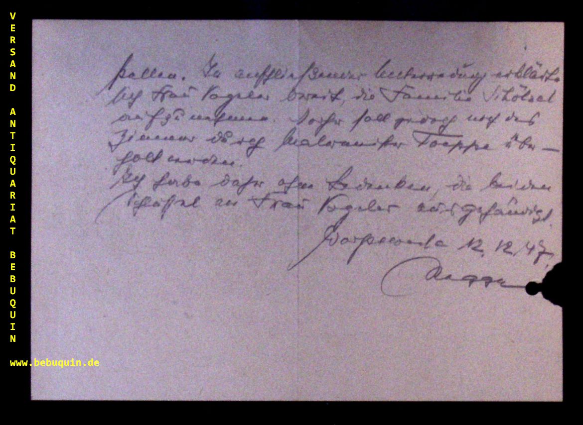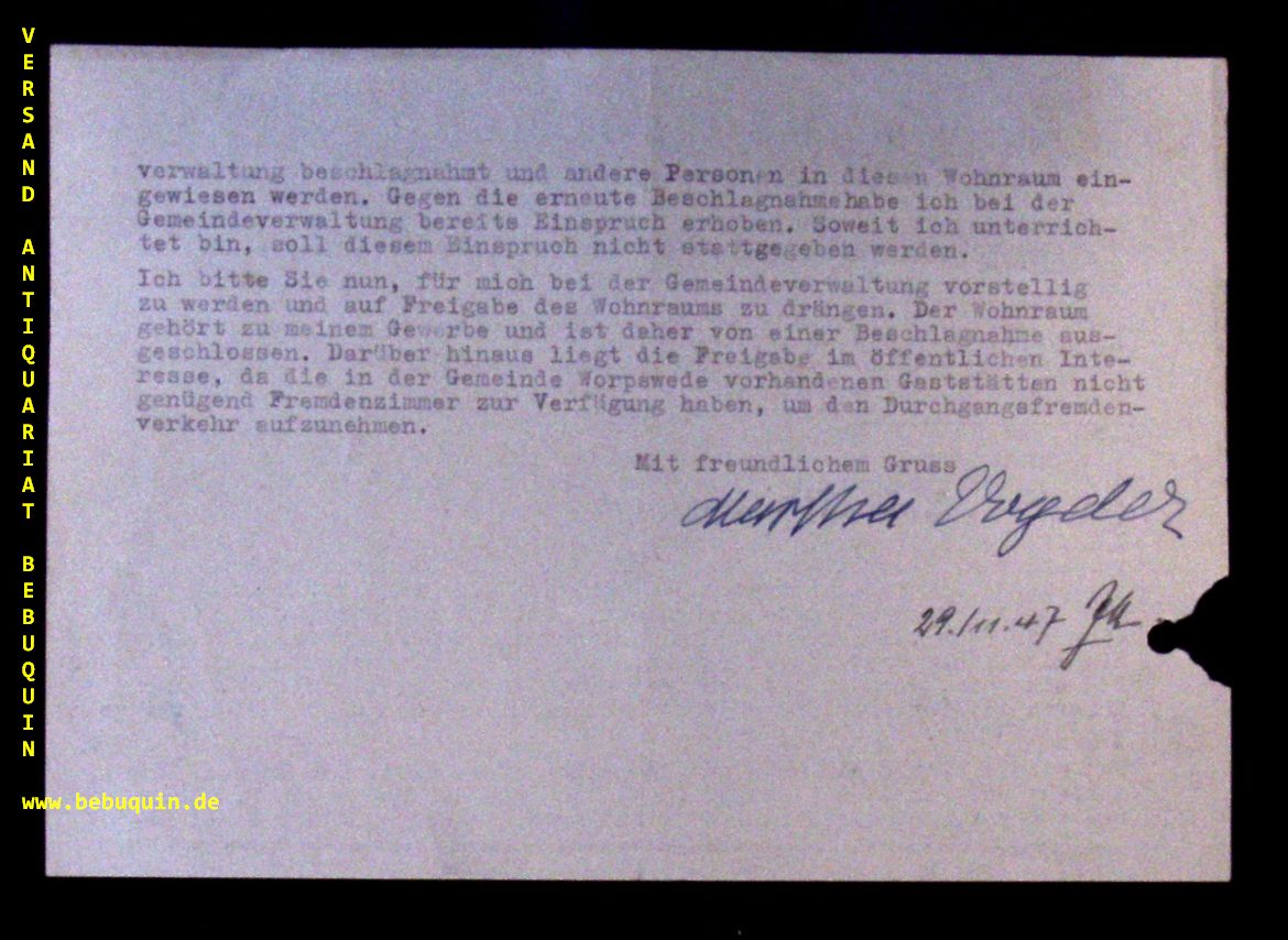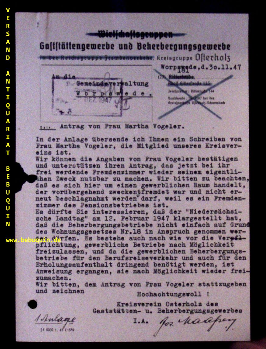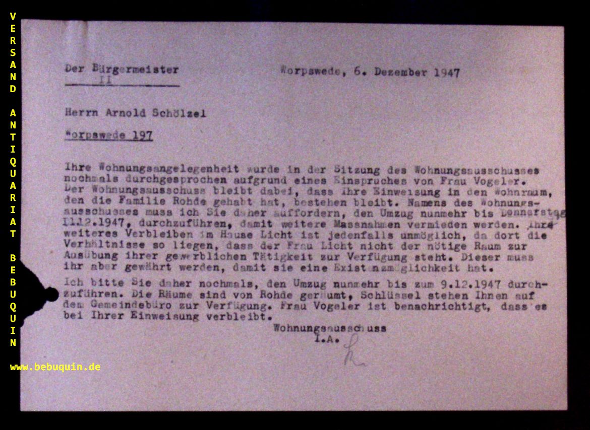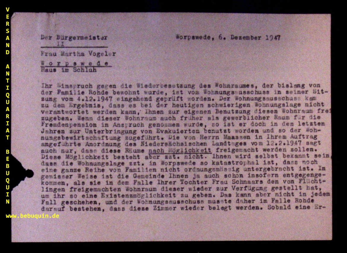 WORPSWEDE.– VOGELER, Martha.– 4 voll signierte ms Briefe auf Kopfbögen des „Haus im Schluh“ mit diversen Antwortschreiben. „Meine Tochter, Frau Martha Schnaars geb. Vogeler, Worpswede 150 möchte für mich Heimarbeit machen. Sie ist darauf angewiesen, sich eine Existenz zu schaffen, da sie von ihme Mann bisher keinerlei Nachricht hat. Sie besitzt einen Webstuhl, den sie aber bis jetzt noch nicht aufstellen konnte, weil sie mit ihrem Kind nur einen Raum hat zum Wohnen und Schlafen. Der zweite Raum, in dem sie früher den Webstuhl aufgestellt hatte, war bisher von Flüchtlingen belegt, die jetzt nach Bremen verzogen sind. Ich wäre Ihnen nun sehr dankbar, wenn sie diesen Raum für meine Tochter zum Arbeiten freigeben würden. Mit freundlichen Grüßen Martha Vogeler.“ Der ganze Vorgang zieht sich über zwei Monate hin und ist letztlich erfolgreich. Ein beeindruckendes Zeitdokument über das Leben nach dem Krieg. Worpswede, 3.3.1901. 7 Bl. seitliche Lochung teils ausgerissen. Diese Brieffolge stellt eine wichtige Ergänzung zu den bekanten Fakten zum Leben im Haus im Schluh dar, die im Folgenden kurz wiedergegeben werden.: Martha Schröder wurde als Tochter des Dorfschullehrers Dietrich Schröder und seiner Ehefrau Becka in Worpswede geboren. Der Vater starb 1885, sodass die Mutter die große Familie allein ernähren musste. Die drei ältesten Geschwister Marthas wanderten nach Amerika aus, die jüngeren Geschwister – wie Martha auch – unterstützten die Mutter durch Aushilfsarbeiten. Im Jahr 1894 lernte sie als Vierzehnjährige den in Bremen geborenen Maler Heinrich Vogeler kennen, als dieser Worpswede besuchte und im folgenden Jahr Mitglied der 1889 gegründeten Künstlerkolonie Worpswede wurde. Im Oktober 1895 kaufte Vogeler am Weyerberg ein Grundstück mit Bauernhaus, ließ dieses nach eigenen Plänen umbauen und gestaltete den Barkenhoff zu einer Insel der Schönheit. Martha stand Vogeler mehrfach Modell und heiratete ihn nach der Verlobung 1900 in Meissen am 6. März 1901. In der Folge war sie der Mittelpunkt des von Vogeler als Gesamtkunstwerk inszenierten gemeinsamen Haushaltes auf dem Barkenhoff und wurde von ihm weiterhin auf vielen Gemälden und Radierungen porträtiert. Sie ist dei große Muse des deutschen Jugendstils. (Wikipedia)