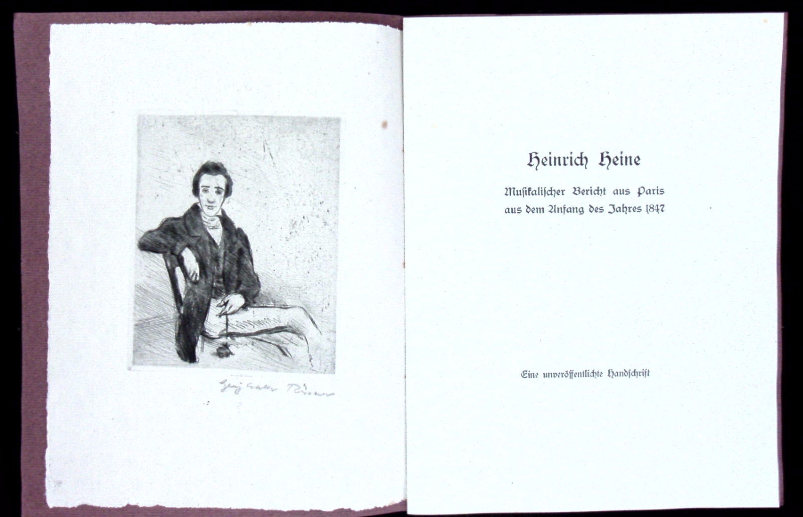 RÖSSNER.– HEINE, Heinrich: Musikalischer Bericht aus Paris aus dem Anfang des Jahres 1847. Eine unveröffentlichte Handschrift. Weimar (Gesellschaft der Bibliophilen), 1921. 4°. 9 Bl. mit einer eigenhändig signierten ORadierung von Georg Walter Rössner als Frontispiz. OBr. feines Ex. Nr. 109 einer handschriftlich numerierten kleinen Aufl.
