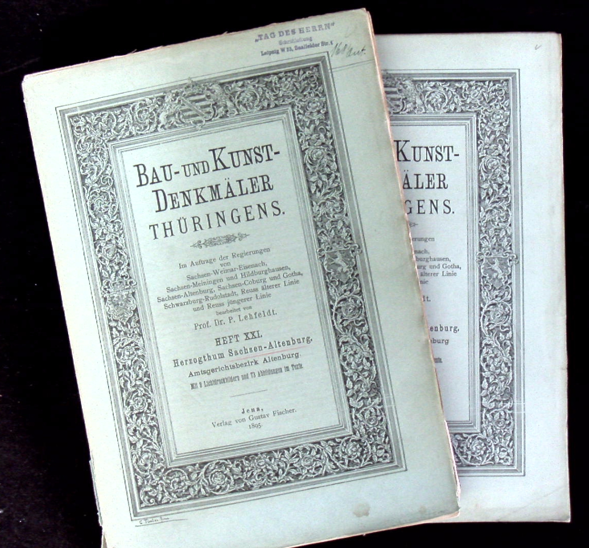 THÜRINGEN.– LEHFELDT, Paul: Herzogthum Sachsen – Altenburg. Amtsgerichtsbezirke Altenburg, Ronneburg und Schmölln. 2 Bände. Jena (Gustav Fischer), 1895.. 4°. VII, 435, VIII S. mit 9 Lichtdruckbildern und 90 Abbildungen im Texte. ill. OKart. NaT, unbeschnitten, sonst gut erhalten. = Die Bau- und Kunst-Denkmäler Thüringens. Heft XXI + XXII. EA.