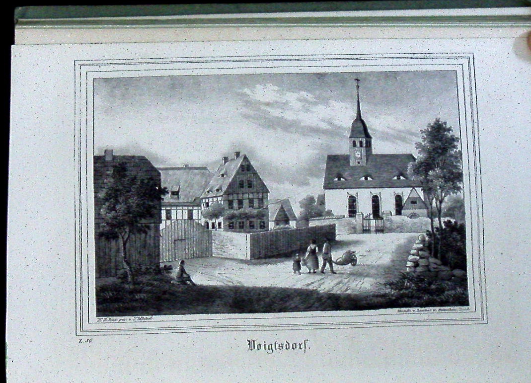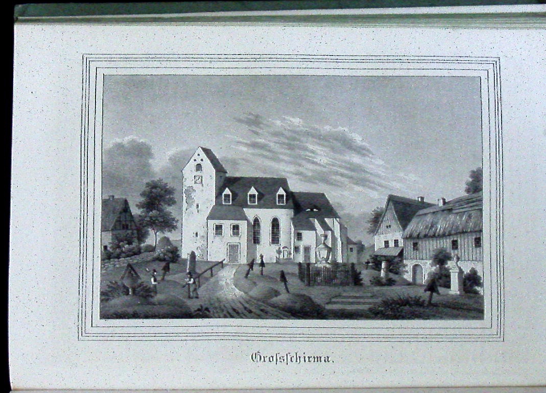 FREIBERG.– SACHSENS KIRCHEN – GALERIE (Kirchengalerie).– Zweiter Band. Die Inspection Freiberg als dritte Abtheilung. Lieferung 38 – 70 (= 33 Lieferungen) in 1 Bd. ( so komplett). Dresden, (Schmidt), 1838. 4°. [1] Bl., S. 150 – 280 mit 64 lithographischen Tafeln mit 65 meist ganzseitige lithografische Ansichten der Dörfer und Kirchen. sowie 1 mehrfach gefaltetes lithographisches Prämienblatt. Bedruckter grüner OPb. Rücken gebräunt, eine Lage lose, vereinzelte Stockflecken, insgesamt von sehr feiner Erhaltung . Der hier vorliegende 2. Bd. der Reihe behandelt sehr zahlreiche Ortschaften der Region um Freiberg mit eindrucksvollen Ansichten: Lichtenberg, Weigmannsdorf, Colmnitz, Naundorf, Ober-Schöna, Linda, Wegefarth, Cuttendorf, Ober Bobritzsch, Weissenborn, Hilbersdorf, Dorfhain, Oederan, Kirchbach, Grillenburg, Klingenberg, Pretzschendorf, Reichenbach, Bräunsdorf Eppendorf, Frankenstein, Gahlenz, Gränitz, Groß-Schirma, Krummenhennersdorf, Langenau, Zethau etc. Bemmann-Jatzwauk 1/2, 385.