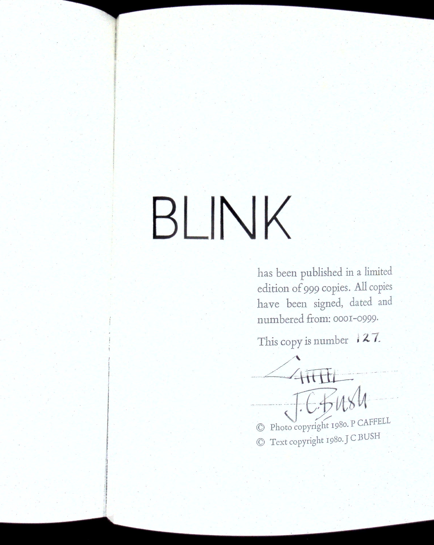 CAFFELL.– BUSH, John Carder: Blink. Pause within a moment. A Photographic essay by Paul Caffell. London (Dick Blixby), 1980. 4°. ca 50 S. mit fotografischen Bildtafeln auf unterschiedlichen Papieren. ill. OKart. Einband foliert. Nr. 127 von 999 Ex. der EA mit den eigenhändigen Signaturen von Autor und des Fotograph. Paul Caffell (1939 – 2017) war ein berühmter Fotograph.