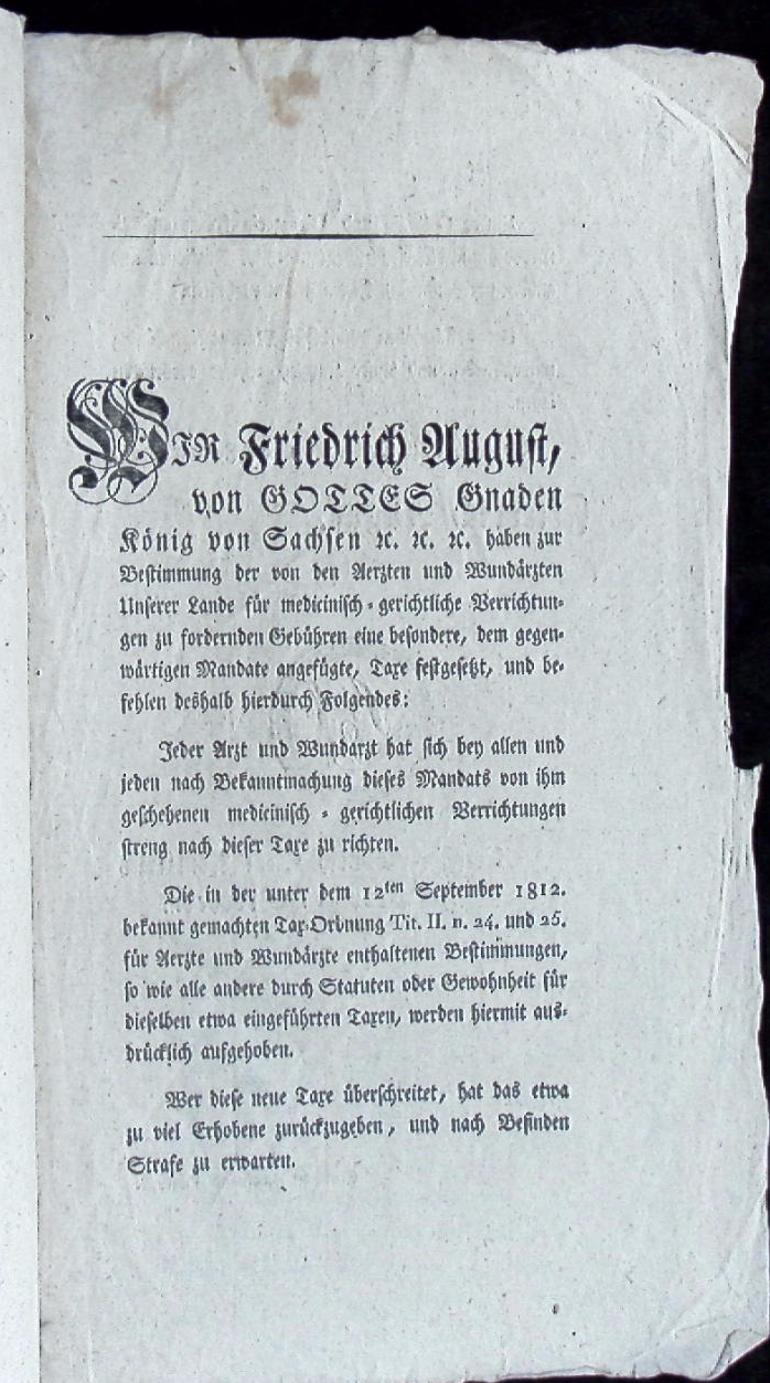 EDIKTE.– FRIEDRICH AUGUST I. (1. KÖNIG VON SACHSEN): Mandat für Ärzte und Wundärzte vom 19. Februar 1816. Betrifft die Einführung einer Gebühren-Taxe bey medicinisch-gerichtlichen Handlungen. Dresden, 1816. Gr. 4°. 4 S. mit Kopfstichen. feines Ex. Unterzeichnet von Ernst Friedrich Carl Aemilis Freyherr von Werthern und Christian Ferdinand Kaiser.