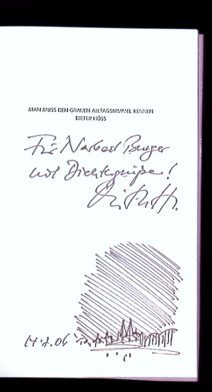 HÖSS, Dieter: Man muss den grauen Alltagshimmel kennen. Kölner Sonette. Köln (Greven), 2006. 128 S. OPb mit OUmschl. tadellos. EA mit einer eigenhändigen Widmung des Verfassers an den Bürgermeister Norbert Burgerund mit einer eigenhändigen Zeichung des Kölner Stadtzpanoramas auf Vortitel.