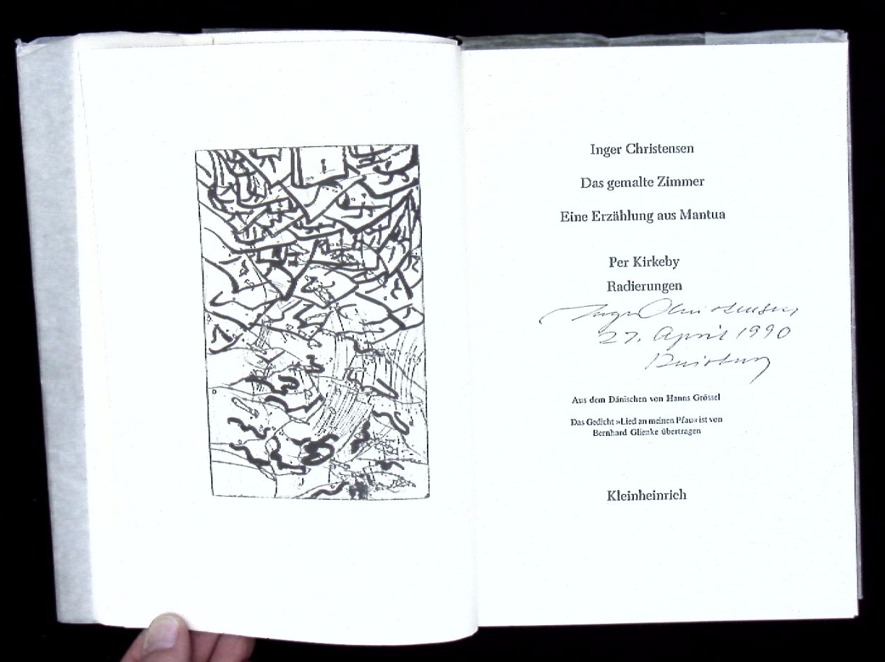 CHRISTENSEN, Inger: Das gemalte Zimmer. Eine Erzählung aus Mantua. D.v. Hanns Grössel. 2. Aufl. Münster (Kleinheinrich), 1990. Gr. 8°. 105 S. mit zahlr. ganzseitigen Radierungen von Per Kirkeby und 1 Beil.: Falttaf. OKart. tadellos. = Dänische Literatur der Moderne, 4. EA mit einer eigenhändigen 3zeiligen datierten Widmung der Autorin auf Titelseite. Inger Christensen (* 16. Januar 1935 in Vejle, Dänemark; † 2. Januar 2009 in Kopenhagen) war eine dänische Schriftstellerin. Sie zählte zu den bedeutendsten europäischen Lyrikerinnen ihrer Generation. (Wikipedia)