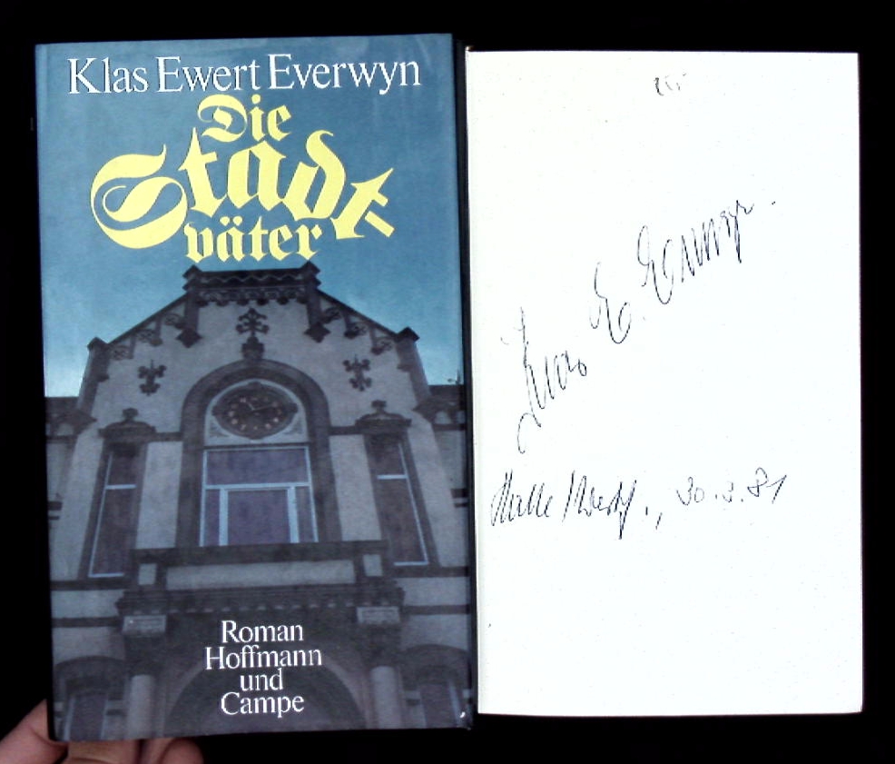 EVERWYN, Klas Ewert: Die Stadtväter. Roman. 1. Aufl. Hamburg (Hoffmann und Campe), 1980. Oktav. 282 S. OPb mit OUmschl. gutes Ex. EA mit der datieren eigenhändigen Signatur des Verfassers auf Voratz.