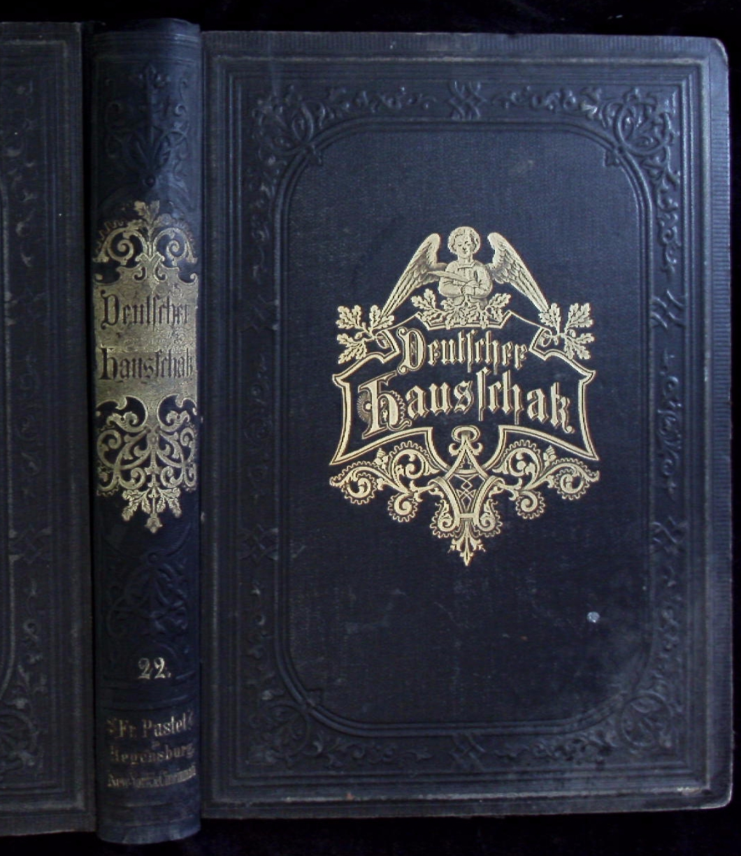 MAY, Karl: Die Felsenburg. Reiseerzählung. In: Deutscher Hausschatz in Wort und Bild. Regensburg (Pustet), 1893/94. Gr. 4°. 4 Bl., 824 S. mit zahlreichen Holzstichen sowie 72 S. „Für die Frauenwelt“. ill. OHLn mit reicher Goldprägung. etwas schief gelesen und gelockert, vereinzelt braunfleckig, sonst gut. = 20. Jg. EA. Plaul 248.