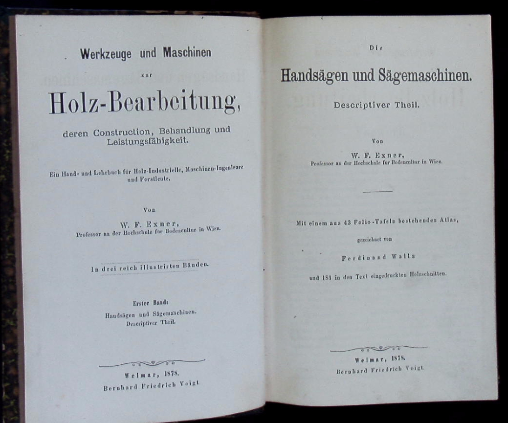 TECHNIK.– EXNER, Wilhelm Franz: Werkzeuge und Maschinen zur Holz-Bearbeitung, deren Construction, Behandlung und Leistungsfähigkeit. Ein Hand- und Lehrbuch für Holz-Industrielle, Maschinen-Ingenieure und Forstleute. 1. Band: Die Handsägen und Sägemaschinen. Descriptiver Theil. Weimar (Voigt), 1878. XXIII, 549 (10) S. mit einem aus 43 Folio-Tafeln bestehenden Atlas gezeichnet von Ferdinand Walla und 181 Textholzschnitten. HLdr der Zeit mit goldgeprägtem Rücken. kanten berieben. EA. Wilhelm Franz Exner (* 9. April 1840 in Gänserndorf, Niederösterreich; † 25. Mai 1931 in Wien) war Ehrenpräsident des Österreichischen Gewerbevereins, Techniker und Forstwissenschaftler. (Wikipedia)