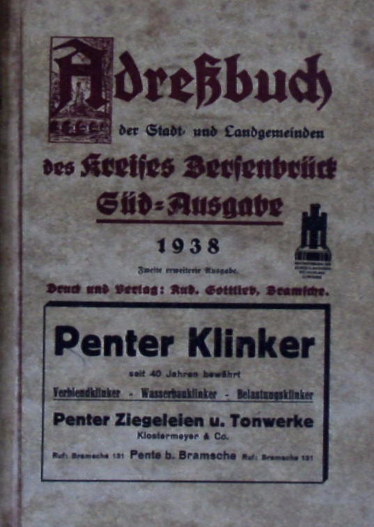 BERSENBRÜCK.– ADRESSBUCH DER STADT- UND LANDGEMEINDEN DES KREISES BERSENBRÜCK 1938.– Süd-Ausgabe. 2. erweiterte Ausgabe. Bramsche (Gottlieb), 1938. 354 S.+ 1 Faltkarte im Anhang ill. OPb. mit zahlr. Abb. vereinzelt gebräunt, Klammern angerostet, sonst sehr feines EX. mit den politischen Adressen. Seltenes Adressbuch. Umfaßt die Orte Achmer, Alfhausen, Ankum, Aslage, Balkum, Biste, Bramsche, Brickwedde, Döllinghausen, Engelern, Engter, Epe, Evinghausen, Heeke, Hesepe, Hinnenkamp, Hörsten . . . Wallen, Weese, Westerholte.