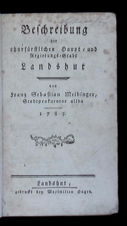 LANDSHUT.– MEIDINGER, Franz Sebastian: Beschreibung der churfürstlichen Haupt- und Regierungs-Stadt. Vom Stadtprokurator allda. Landshut (Hagen), 1785. kl. 8°. 253 S., 1 Bl. mit gestochenem Buchschmuck. Pb der Zeit. Einband mit Buntpapierüberzug, oberes Kap mit Fehlstelle, Papier teils fingerspurig EA.
