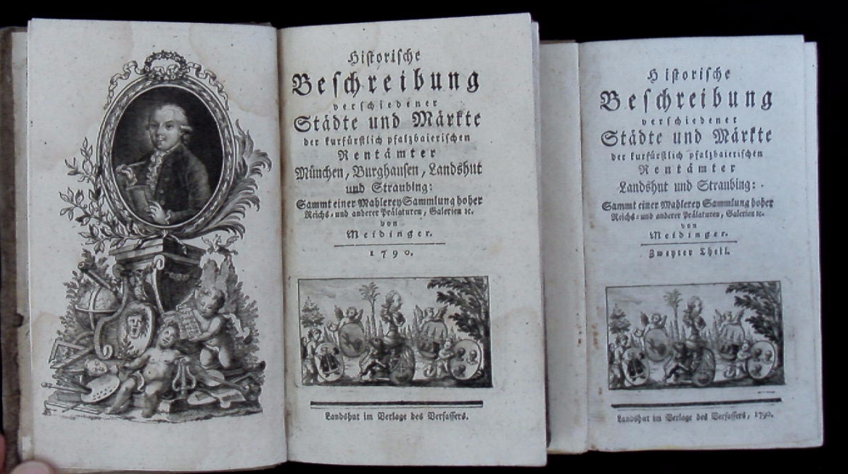 BAYERN.– MEIDINGER, Franz Sebastian: Historische Beschreibung verschiedener Städte und Märkte der kurfürstlich pfalzbaierischen Rentämter München, Burghausen, Landshut und Straubing. Sammt einer Mahlerey Sammlung hoher Reichs- und anderer Prälaturen, Galerien etc. 2 Bände. Landshut (Selbstverlag), 1790. Oktav. 12 Bll., 370 SS.; 266 SS., 2 w. Bll., mit 2mal ders. gest. Titelvign. , 4 gef. Tab. Pb der Zeit mit Titelaufkleber. Interimseinbände, innen sehr gut erhalten. EA. Lentner 3849; Pfister I, 543.