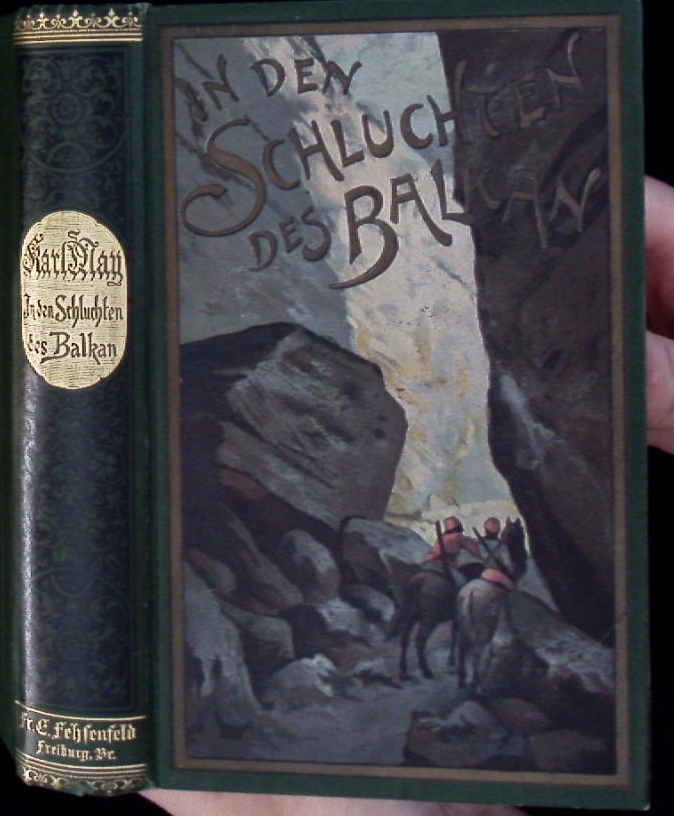 MAY, Karl: In den Schluchten des Balkan. Reiseerlebnisse. 21.– 25. Tsd. Freiburg (Fehsenfeld), (1898). 607 S. farb. ill. OLn. Plaul 44. feines Ex. mit farbstarkem Deckel und goldglänzendem Rücken. = Gesammelte Reiseromane, Bd. IV. Frühe Buch-Ausgabe Plaul 232.4.