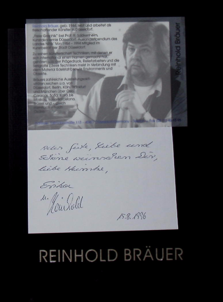 BRÄUER.– BRÄUER, Erika: (Gestaltung) Reinhold Bräuer. Bildband mit Reflexionen zu reinhold Bräuer von Ingrid Skiebe. Düsseldorf (Bräuer), 1996. 4°. 24 Bl. mit teils farb. Bildatfeln. OKart mit Silberprägung. gutes Ex. EA mit eigenhändigen Widmungen und Beilagen von Reinhold Bräuer.