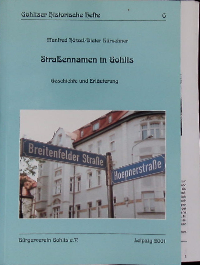 LEIPZIG.– HÖTZEL, Manfred: Straßennamen in Gohlis. Geschichte und Erläuterung. Leipzig (Bürgerverein Gohlis), 2001. 112 S. mit zahlr. farb. Karten. ill. OKart. tadellos. = Gohliser Historische Hefte, 6. EA.