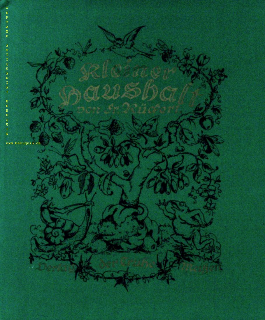 GELBHAAR.– RÜCKERT, Friedrich: Kleiner Haushalt. Meißen (Truhe), (1921). Gr. 8°. 4 Bl. mit 8 Originallithographien von Alfred Gelbhaar. ill. OSeideneinband. Ecken und Kanten minimal berieben, sehr schönes Ex. Nr. 157 von 175 Ex. der EA, vom Künstler signiert und nummeriert gebunden in grüner Ganzseide.