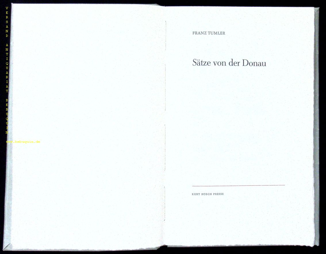 TUMLER, Franz: Sätze von der Donau. Zürich (Bösch), 1965. 77 (1) S. OKart. feines Ex. = 7. Druck der Kurt Bösch Presse auf Zerkall-Bütten. 1 von 275 nummerierten und vom Dichter eigenhändig signierten Ex. der EA. WG² 36 ist falsch.