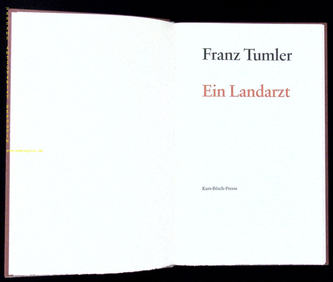 TUMLER, Franz: Ein Landarzt. Zürich (Bösch), 1972. 45 (2) S. OKart. feines Ex. = 8. Druck der Kurt Bösch Presse auf Zerkall-Bütten. 1 von 275 nummerierten und vom Dichter eigenhändig signierten Ex. der EA. WG² 37.
