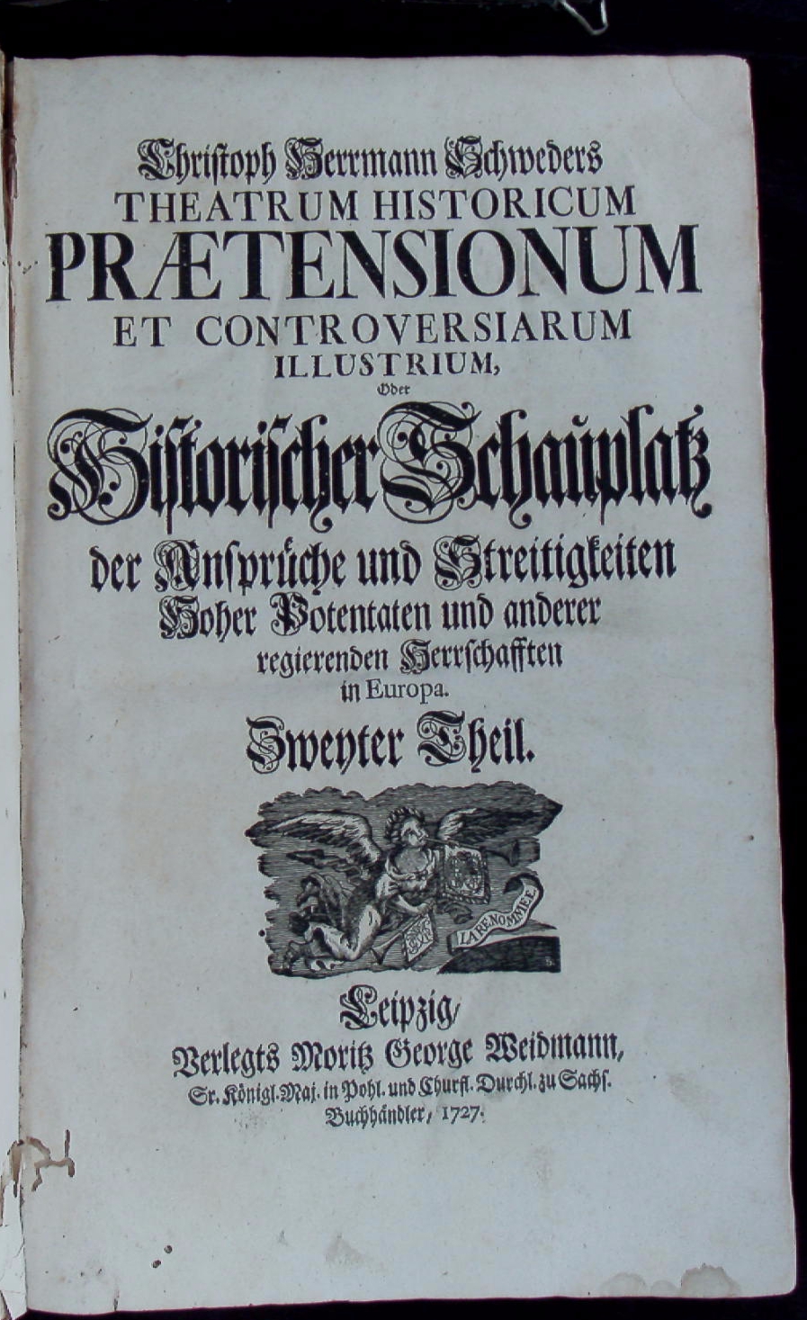 SCHWEDER, Christoph Hermann von: Theatrum Historicum Prætensionum Et Controversiarum Illustrium. Oder Historischer Schauplatz der Ansprüche und Streitigkeiten Hoher Potentaten und anderer regierenden Herrschafften in Europa … Zweyter Theil (von 2). Leipzig (Weidmann), 1727. 2°. 1 Bl., 672 S. mit 1 gefaltetem Blatt und fein gestochenem Buchschmuck. OLdr der Zeit auf 7 Bünden. Einband teils leicht berieben, eine Ecke mit mikroskopischer Wurmspur, sonst in guter Erhaltung. Diese zweite Auflage wurde von Adam Fiedrich Glasey bearbeitet. Sie ist zwar auf ganz Europa jedoch vorzüglich auf Deutschland gerichtet und sollte nach Moser von jedem Minister und Publizisten studiert werden, wie Putter im „Deutschen Staatsrecht″+ ausführt.