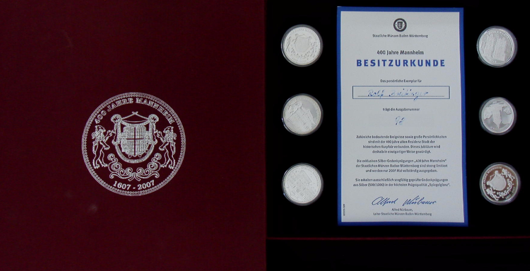 MANNHEIM.– 400 JAHRE MANNHEIM.– 1607 – 2007. Münzkassette mit 6 Silbermünzen. Karlsrohe (Staatliche Münzen baden-Württemberg), 2007. Quer 4°. 6 Münzen in silber-Gedenkprägungen. in silbergeprägter OLnSchatulle. tadellos . Nr. 98 der einmaligen Ausfgabe. Die Münzen in höchster Prägequalität Spiegelglanz mit Bestzurkunde.
