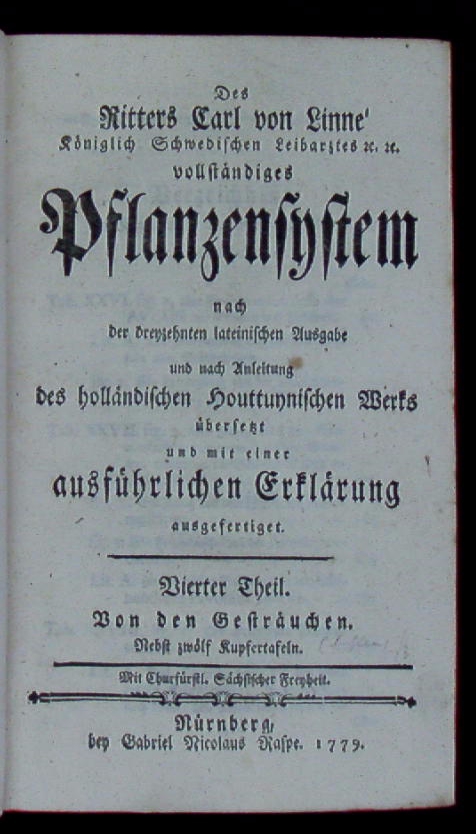 BOTANIK.– LINNE, Carl von: Des Ritters Carl von Linné Königlich Schwedischen Leibarztes vollständiges Pflanzensystem nach der dreyzehnten lateinischen Ausg. und nach Anleitung dess holländischen Houttuynischen Werks übers. und mit einer ausführlichen Erklärung ausgefertiget. 4.Theil: Von den Gesträuchen. Nürnberg, Raspe, 1779. 709 S., [32] Bl Ill. HLdr der zeit auf 6 Bünden. Kanten leicht berieben, es fehlen die Kupfertafeln, sonst sehr gutes Ex. EA mit dem Register der im 3. und 4. Theil enthaltenen Gattungen und Arten.