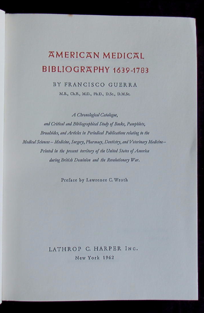 MEDIZIN.– GUERRA, Francisco: American medical bibliography 1639 – 1783. A chronological catalogue, and critical bibliographical study of books, pamphlets, broadsides, and articles in periodical publications relating to the medical sciences printed in the present territory of the United States of America during British Dominion and the Revolutionary War. New York (Harper), 1962. Gr. 8°. 885 S. OLn. Vorsätze mit leichten Klebespuren. sonst gu erhalten. = Publication No. 40. EA.
