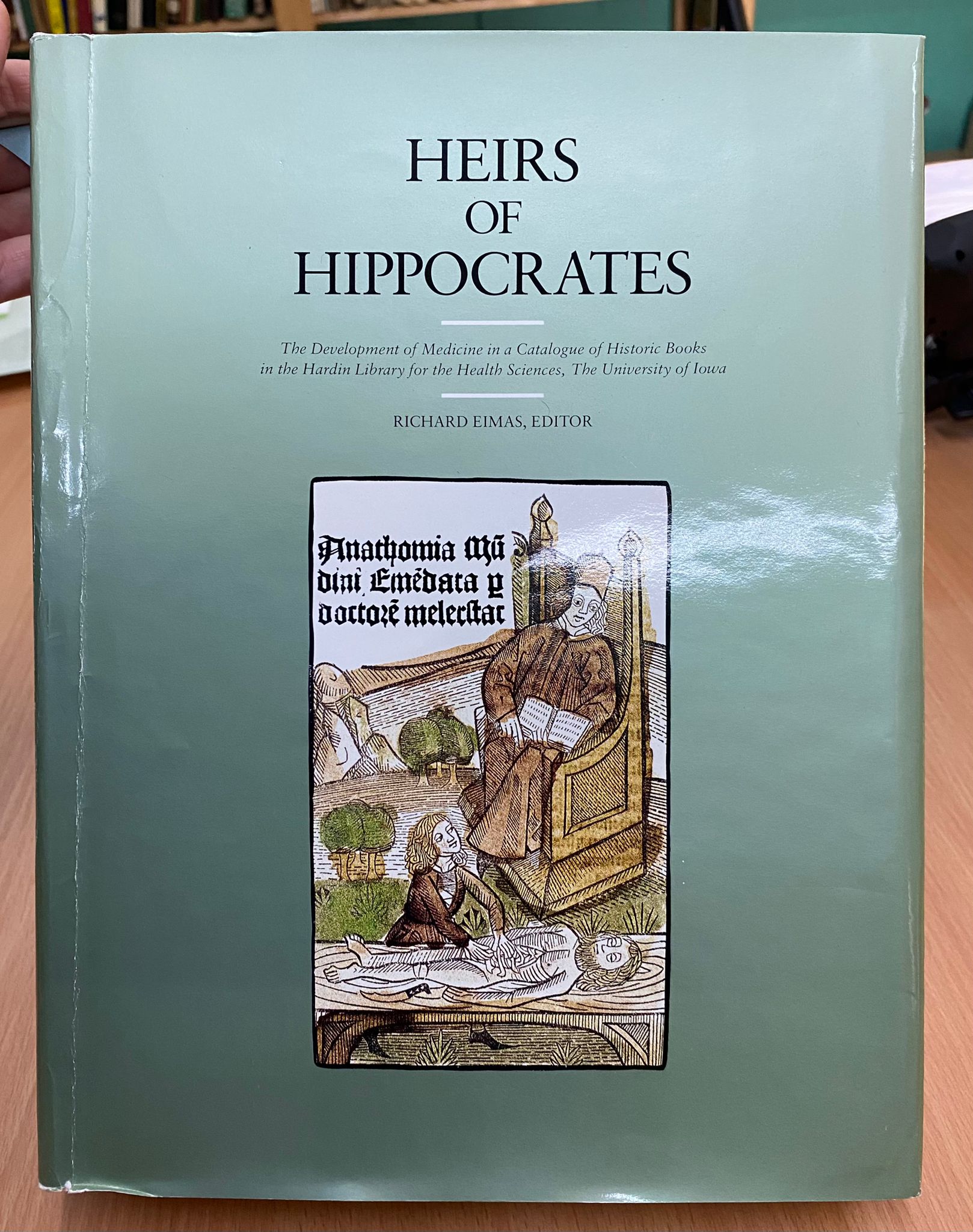 MEDIZIN.– EIMAS, Richard: Heirs of Hippocrates. The development of medicine in a catalogue of historic books in the Hardin Library for the Health Sciences, the University of Iowa. 3. ed. Iowa City ( Iowa Press), 1990. Gr. 4°. XXI, 705 S. mit zahlr. teils farb. Bildern und Bildtafeln. OLn mit OUmschl. feines Ex Heirs of Hippocrates is thoroughly researched and abundantly annotated—an authoritative and scholarly sourcebook for the history of medicine. It is frequently cited and quoted alongside such other respected compendia as Morton’s Medical Bibliography and Bibliotheca Osleriana. In addition to the text, over two hundred illustrations (many in color) taken from the original works amplify the descriptions and provide the reader a sampling of the striking images that can be found in the many of the books.