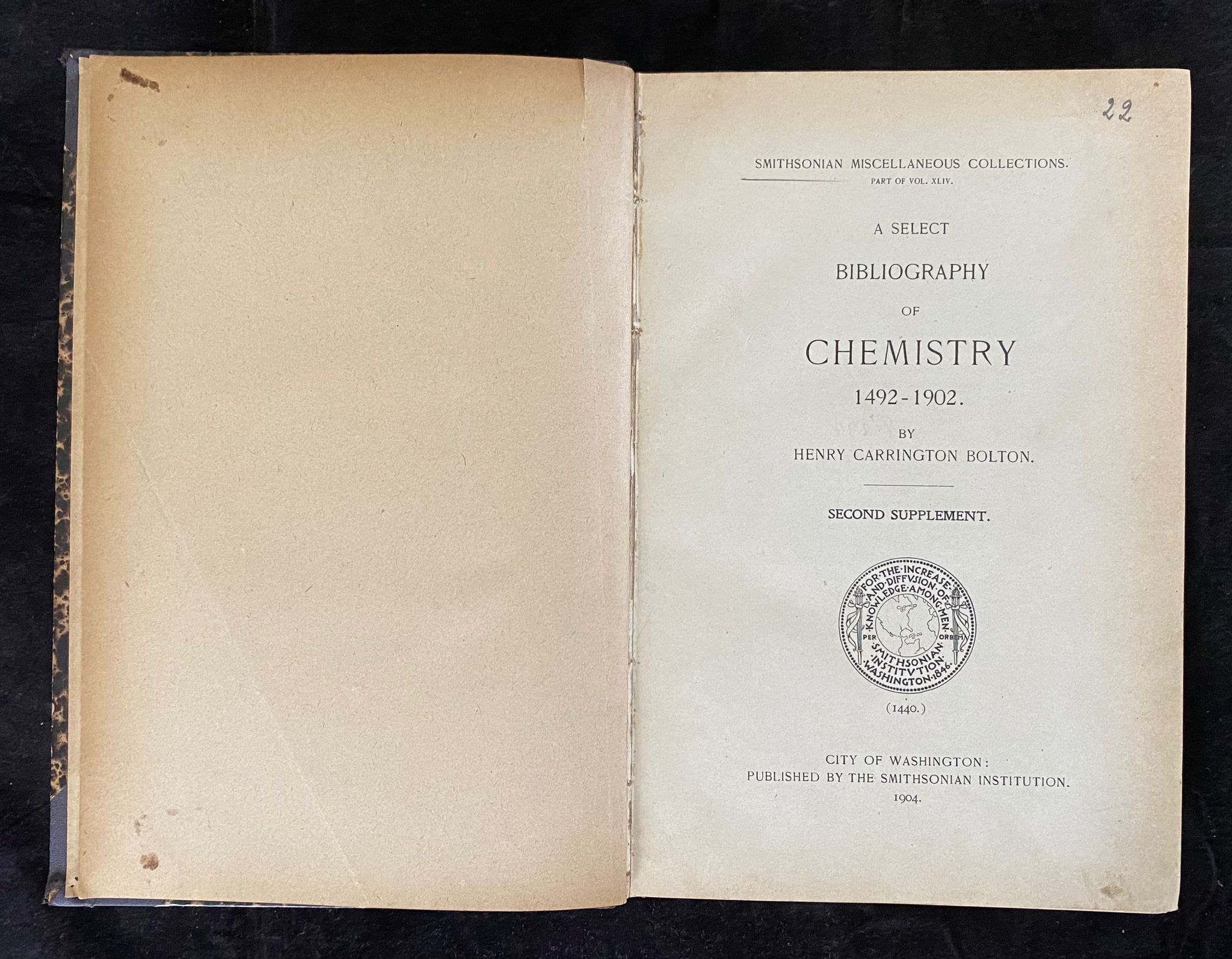 CHEMIE.– BOLTON, Henry Carrington: A select bibliography of chemistry 1492 – 1902. Suppl. 2. Washington (Smithsonian Inst.), 1904. Gr. 8°. 462 S. HLn der Zeit. makuliertes Bibliotheksex. EA. Henry Carrington Bolton (* 8. Januar 1843 in New York City; † 19. November 1903) war ein US-amerikanischer Chemiker.