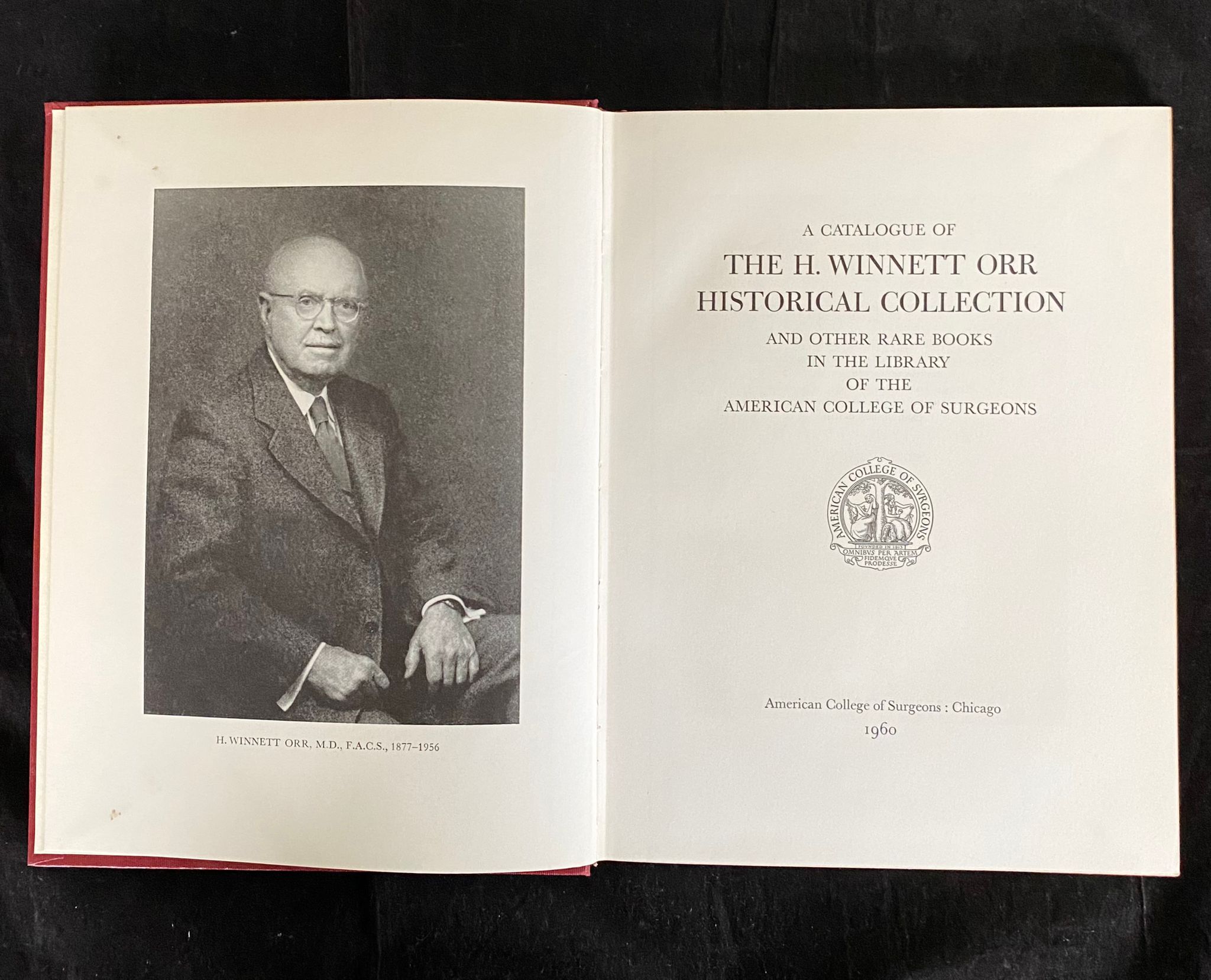 MEDIZIN.– MASON, Michael L.: (Vorw.) A catalogue of the H. Winnett Orr historical collection. And other rare books in the library of teh American College of Surgeons. Chicago (American College of Surgeons), 1960. 4°. XXI, 198 S. mit zahlr. Abb. OLn mit goldgeprägter Deckelvignette. Vorsätze mikt Kleberesten, sonst gut erhalten. EA.