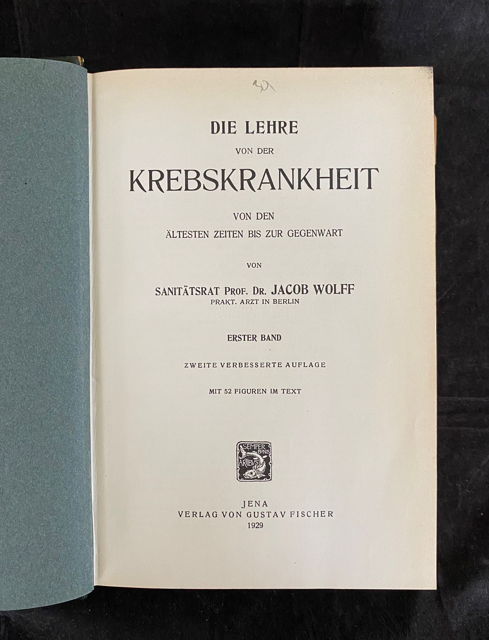 MEDIZIN.– WOLFF, Jakob: Die Lehre von der Krebskrankheit von den ältesten Zeiten bis zur Gegenwart. 1. Band. Zweite verbesserte Auflage. Jena (Gustav Fischer), 1929. XXX, 753 S. mit 52 Textfiguren. OHLdr mit goldgeprägtem Rücken Einbanddeckel angeschmutzt, sonst gut.