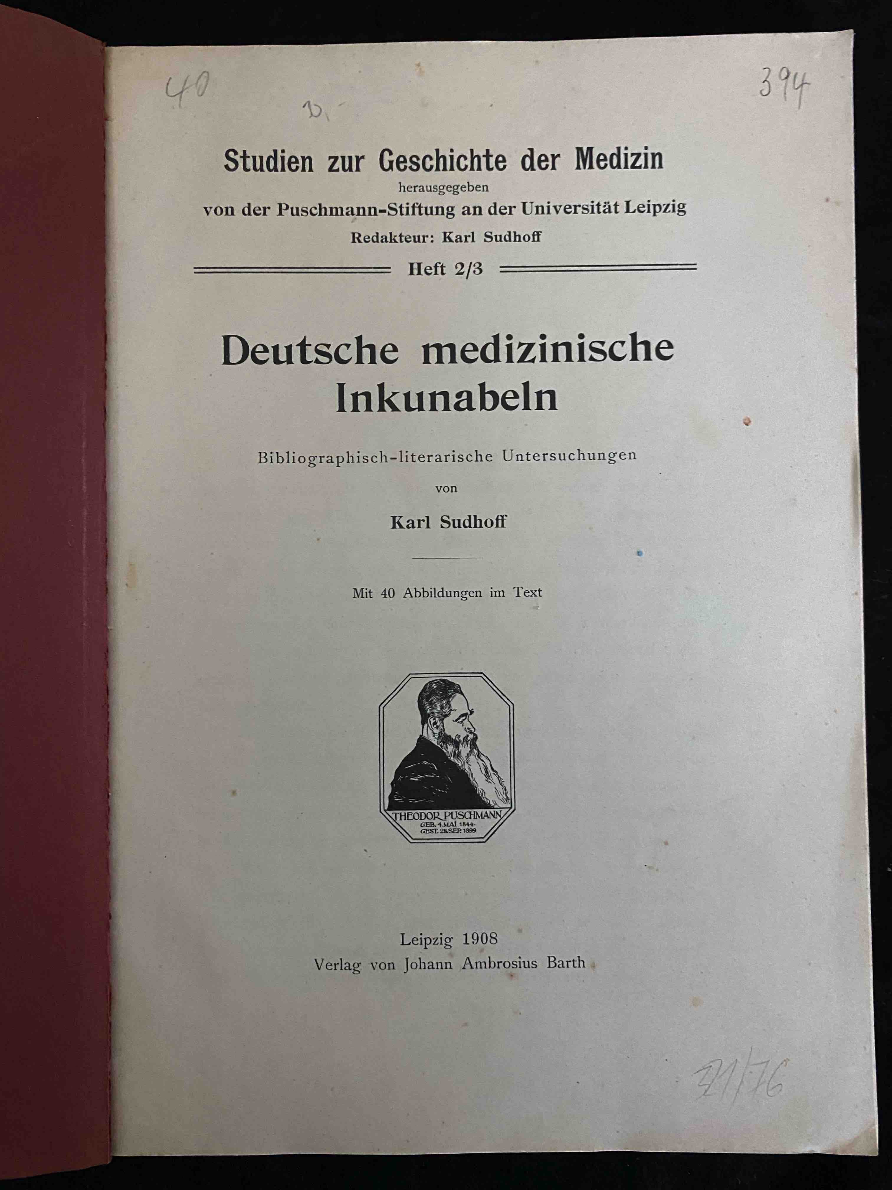 MEDIZIN.– SUDHOFF, Karl: Deutsche medizinische Inkunabeln. Bibliographisch-literarische Untersuchungen. Leipzig (Barth), 1908. 4°. XXIII, 278 S. mit 40 Textabb. schlichte neue Kart. = Studien zur Geschichte der Medizin, 2/3. EA.