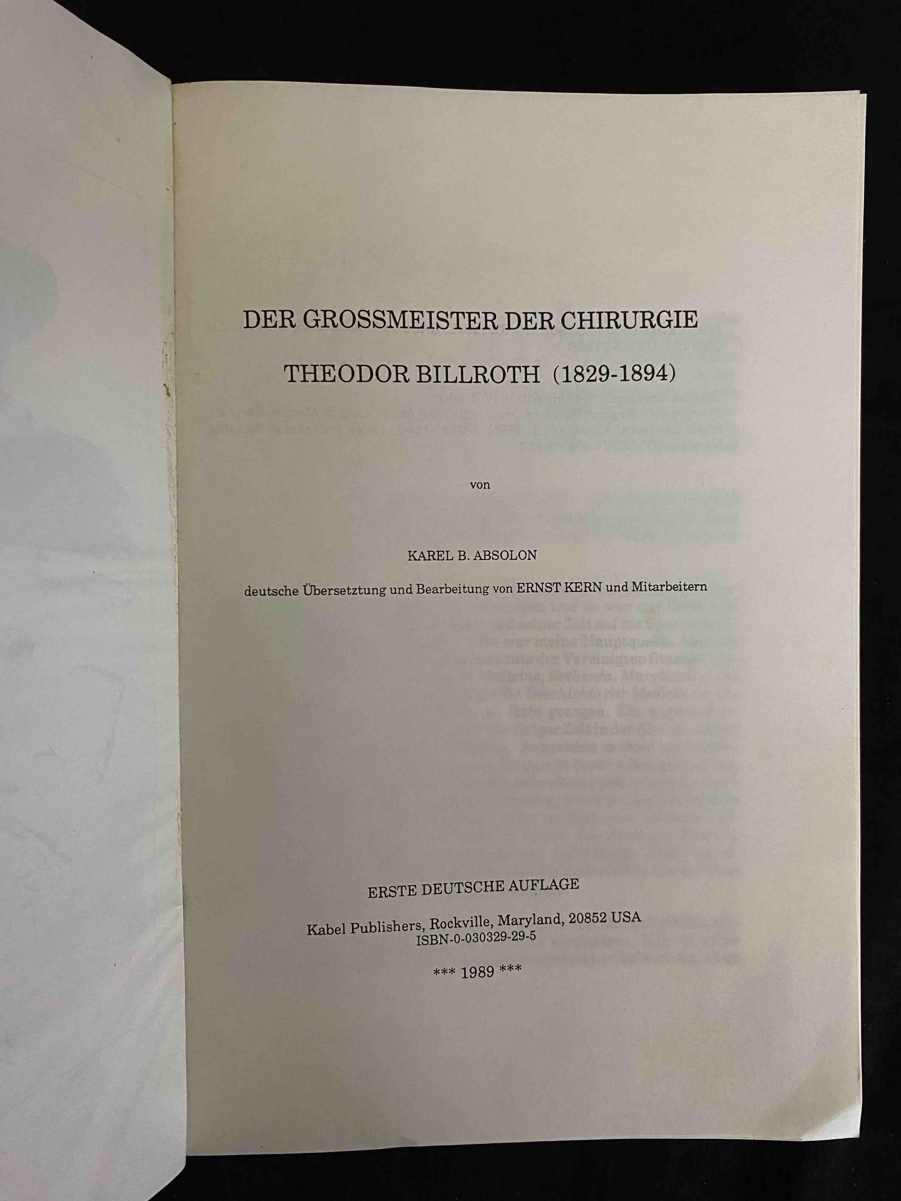 MEDIZIN.– ABSOLON, Karel Bedrich: Der Grossmeister der Chirurgie Theodor Billroth (1829-1894). D.v. Ernst Kern. Rockville (Kabel), 1989. 4°. XII, 413 S. mit zahlr. Abb. ill. OKart. gutes Ex. seltene dt. EA.
