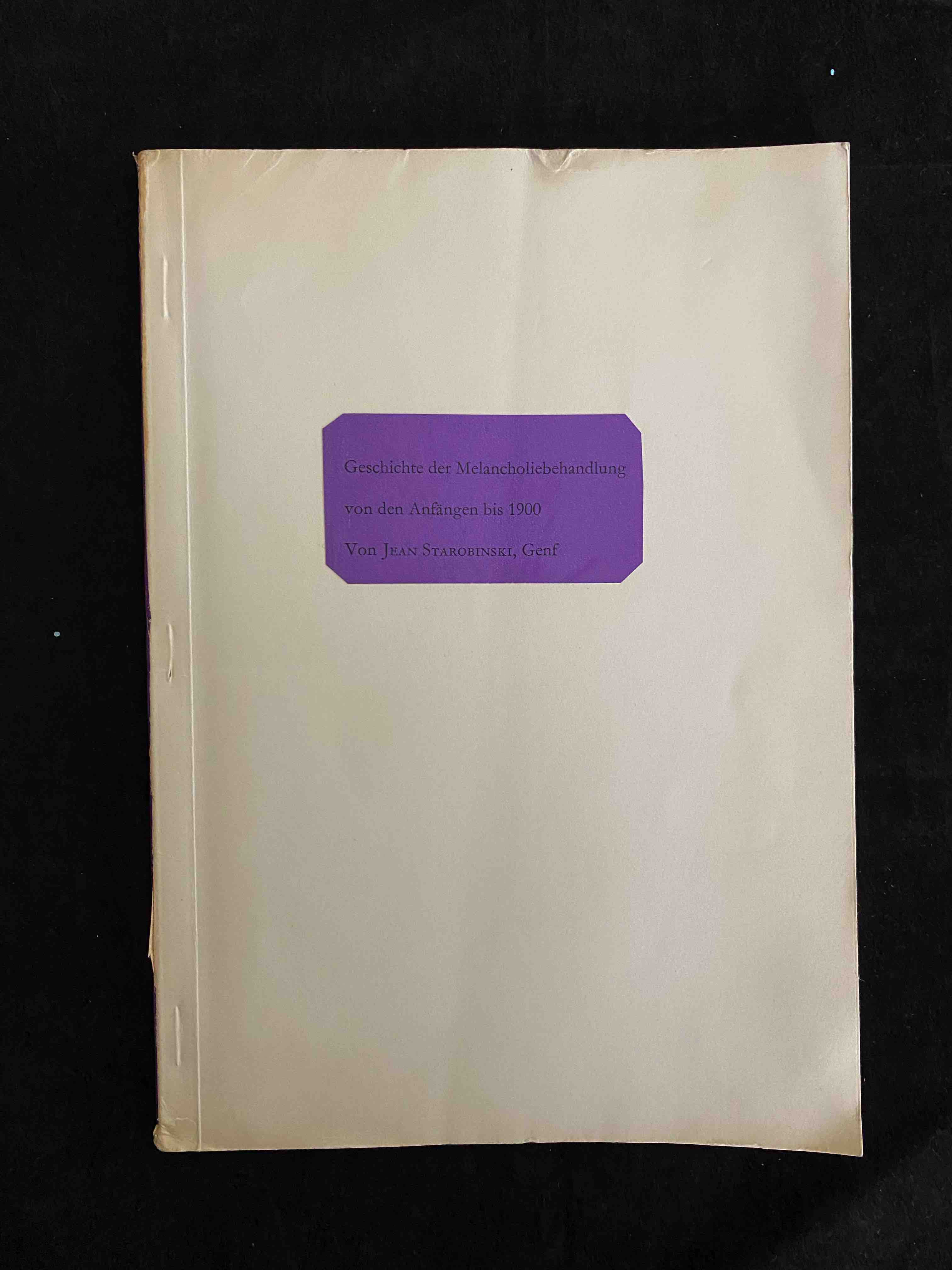MEDIZIN.– STAROBINSKI, Jean: Geschichte der Melancholiebehandlung von den Anfängen bis 1900. Basel (Geigy), 1960. Gr. 8. 111 S. mit Abb. OKart. WaV, Vorsätze mit Kleberesten. = Documenta Geigy. Acta psychosomatica, Nr. 4.
