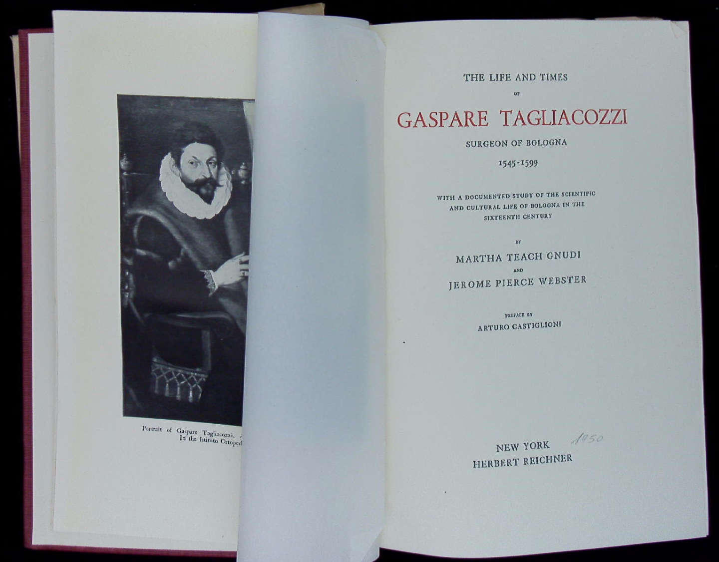 MEDIZIN.– GNUDI, Martha T. + WEBSTER, Jerome Pierce: The life and times of Gaspare Tagliacozzi surgeon of Bologna, 1545-1599. With a documented study of the scientific and cultural life of Bologna in the 16. century. New York (Reichner), 1950. 4°. 1 Titelb., XXII, 538 S. mit zahlr. Abb. und Bildtafeln. OLn mit OUmschl. Umschlag lädiert, Vorsätze mit leichten Kleberesten. EA.