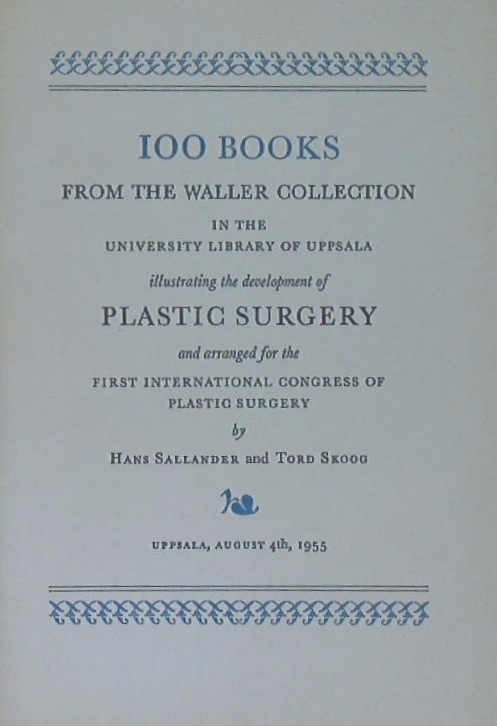 MEDIZIN.– SALLANDER, Hans + SKOOG, Tord: 100 Books from the Waller Collection in the University Library of Upsala. Illustrating the development of Plastic Surgery and arranged for the first Congress of Plastic Surgery. Upsala (IPS), 1955. 21 S. mit Titelbild. OKart. tadellos. EA.
