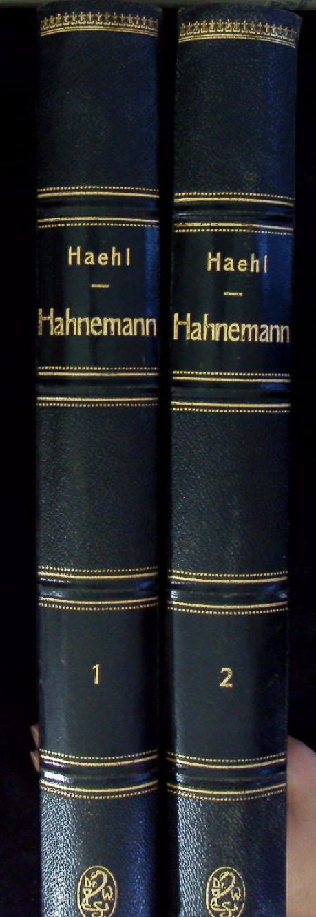 HOMÖOPATHIE.– HAEHL, Richard + SCHMIDT-BUHL, Karl: Samuel Hahnemann. Sein Leben und Schaffen auf Grund neu aufgefundener Akten, Urkunden, Briefe, Krankenberichte und unter Benützung der gesamten in- und ausländischen homöopathischen Literatur. 2 Bände. Leipzig (Schwabe), 1922. XVI, 508, XVI, 527 S. mit 2 Portraits und zahlr. Abb. OHLdr. vorderes Gelenk von Band 2 gelockert, sonst gutes Ex. EA. Die klassische Hahnemann Biographie.